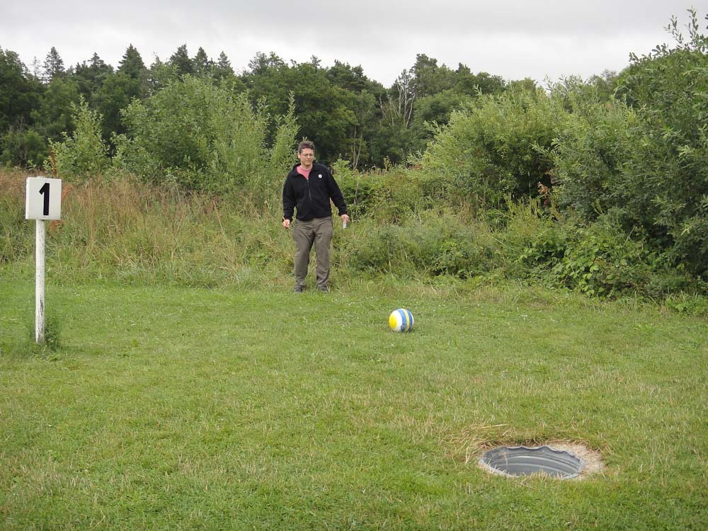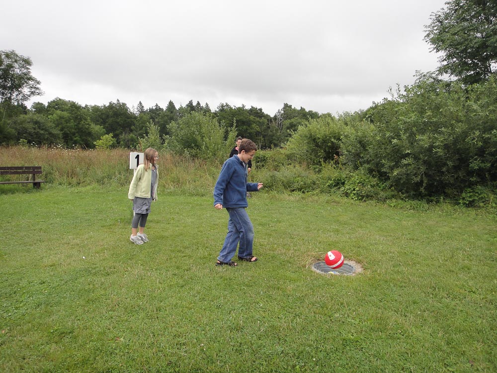 After a tour of a young cave we drove for a long time until we arrived at our destination, a campground. The campground had lots of things to do, but we were there for one reason, soccer golf. Soccer golf has the same rules as golf but the holes are bigger and you kick a soccer ball instead of driving and putting a golf ball. You count how many kicks you need to get the ball in the hole. There were 18 holes, they took up 10 acres alone. We got our balls and began.