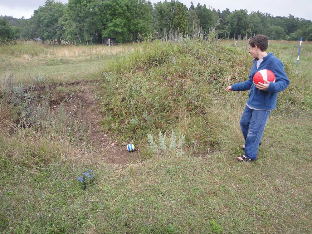 We continued through the last three holes until we got to hole 18. It was the simplest hole of all. It was just a hole in the middle of a big hill four or five feet high. When I tried to kick the ball up the hill, it rolled everywhere but in the hole. Despite the hill Carter and I made it in the hole with four kicks and Dad made it in with five.