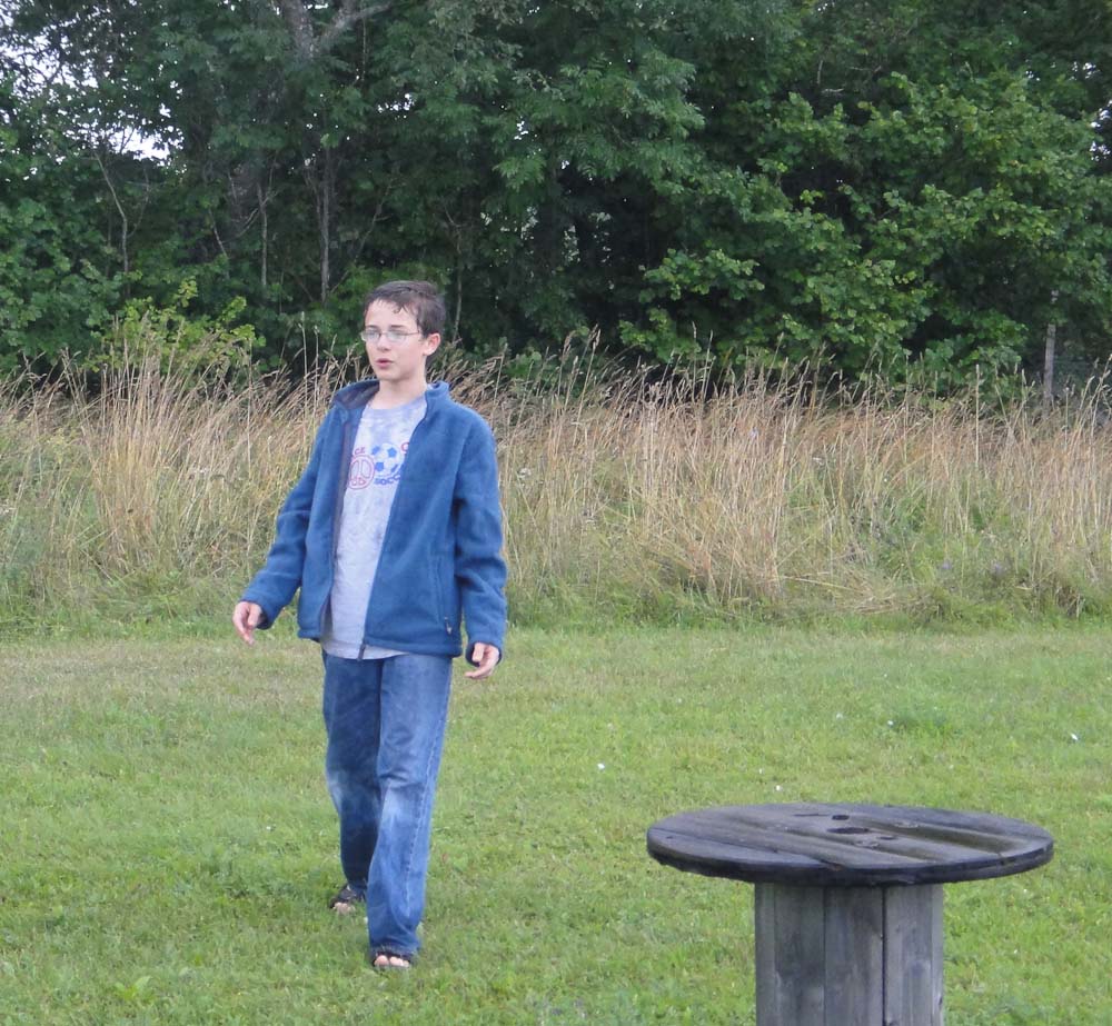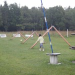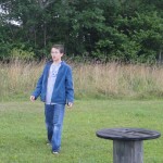 Carter, Dad and I thought the rain just made it more fun. We walked to hole 14. It looked like a giant’s sewing kit. There were a dozen empty spools of thread at least 6 feet tall. We went around all of them and through a set of poles.