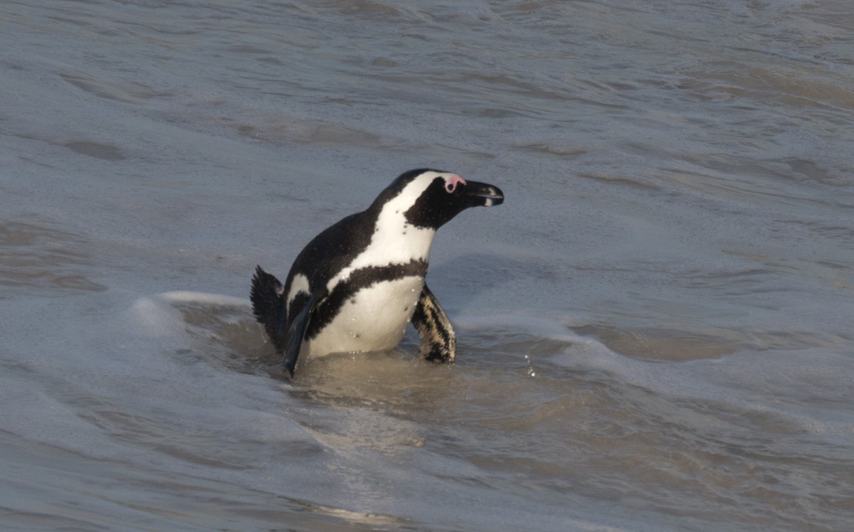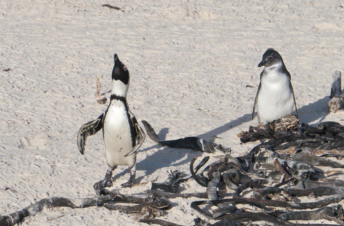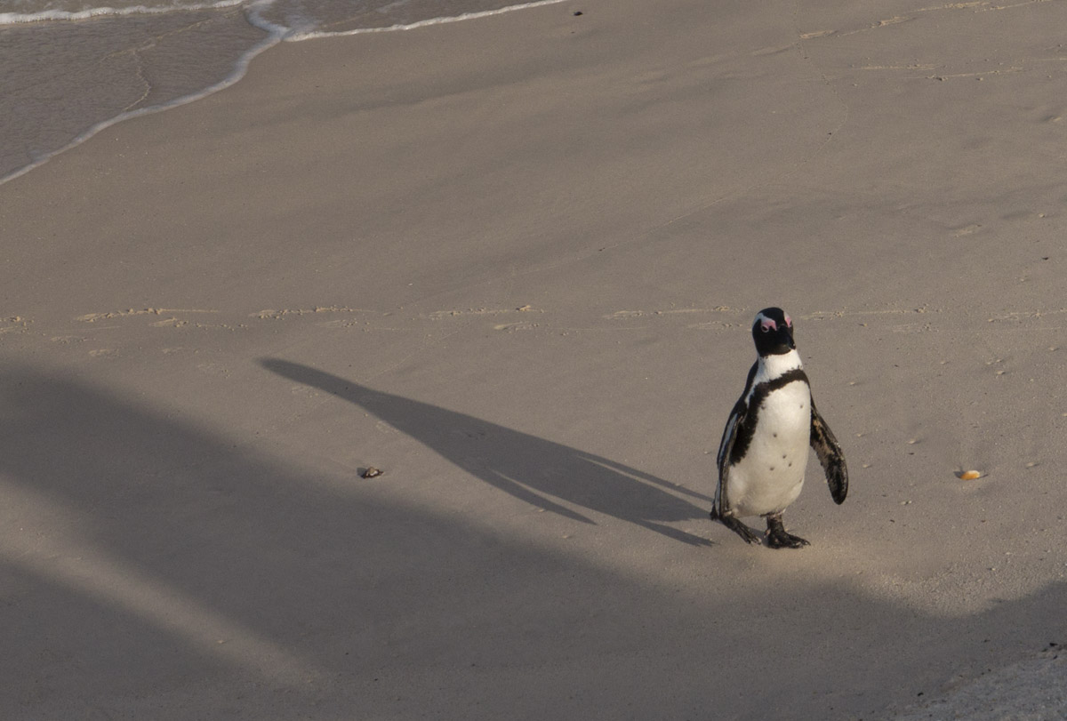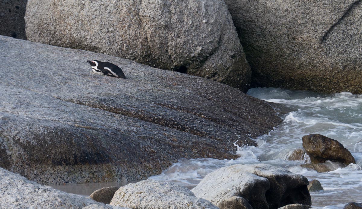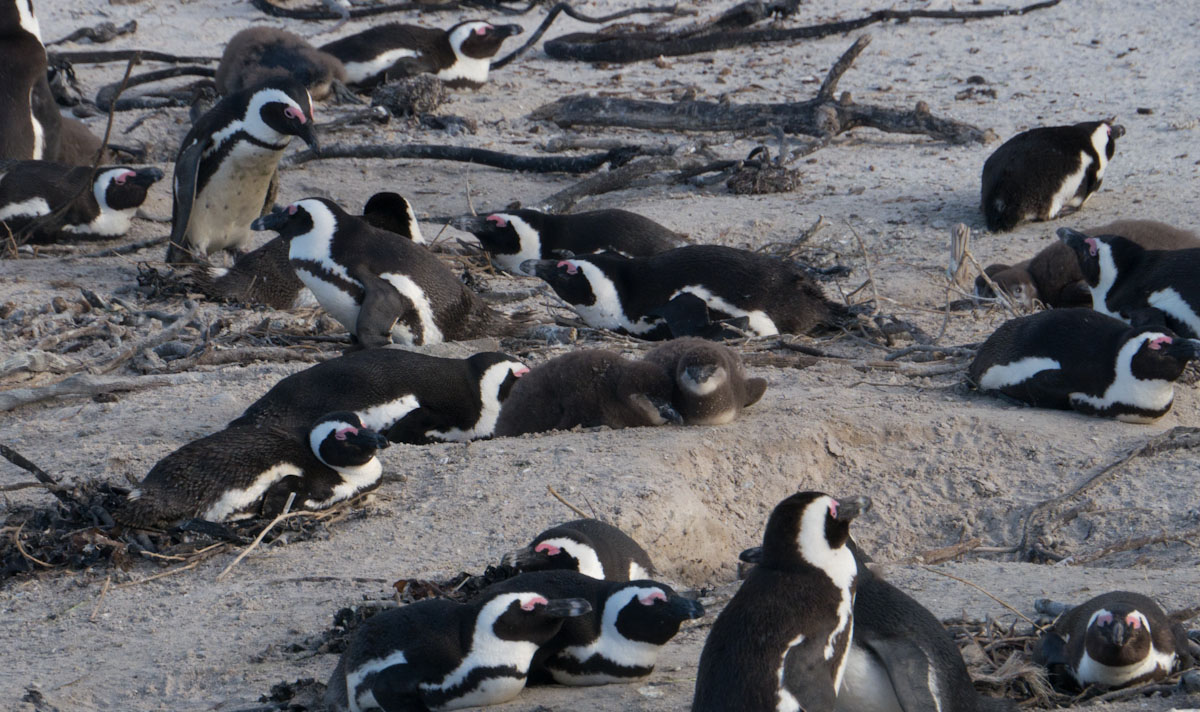 On our way home we saw some penguins and a seal. The penguins, called the African Penguin, are the 3rd smallest species of penguin in the world. So, now we have seen the first (the Little Blue or Fairy Penguin), the second (the Galapagos Penguin), and the third smallest penguins. They were black with white bellies that had black dots. Their eye had a little strip of pink skin leading to their beak, this applies to both eyes. There is also a black band across their upper chest. These little guys spend their days swimming, and eating, and sleeping, or taking care of their offspring. They camp in bush or shallow sand ditches and make little nests. They look like people in suits when they walk and it’s really funny. The Park Rangers also made them little homes out of plastic drums but only a few of them were being used. We also spotted a rare find…a mongoose scampering about and trying to get at the penguin’s eggs! Naughty rodent…