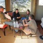 Safari was every morning after breakfast. At 7:00 you hopped in the jeep, pulled on the provided poncho, and hugged you’re bush baby. At around 9:00, you stopped for tea and cookies. Mean while I have been busy checking off all the names of animals everyone threw at me. You returned at 12:00, ate lunch, napped, and got back in the jeep at 3:00. Finally you got back for dinner at 6:30, then immediately crashed when it was over. Every day. Because of the lion tracks and sometimes sightings, at night and in the morning you had to be escorted to and from your cabin, and everywhere you went.