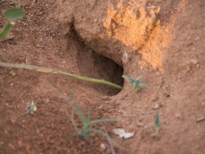 Lastly, we fished for baboon spiders. Baboon spiders are huge and hairy, not totally unlike a tarantula. They have huge gross fangs like a baboon which is where they get their names. They are highly venomous and super mean. The fishing pole is the same as the scorpions but a bit longer. It is a bit easier to fish for baboon spiders because the bottom of their chest is upper sticky. Also like the scorpion they eat grasses so the spider instantly latched on when it came out, and we were done looking at it. It refused to go back in. It was evidently really hungry and I felt a little bad before it started snapping and spitting at us. After a lot of poking, prodding, and push it finally went back into the hole. I studied its home. Of all the holes this one looked the most like a nest, with twigs arranged in a neat circle. It was hard to imagine such an ugly creature making something so pretty, but isn’t that the whole book cover lesson? Did you know that wasps sometimes attack baboon spiders?
