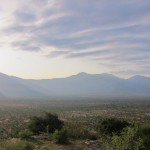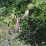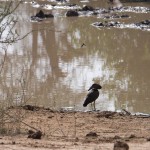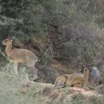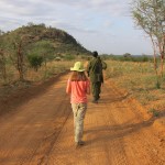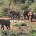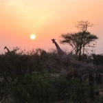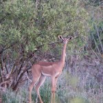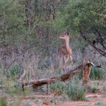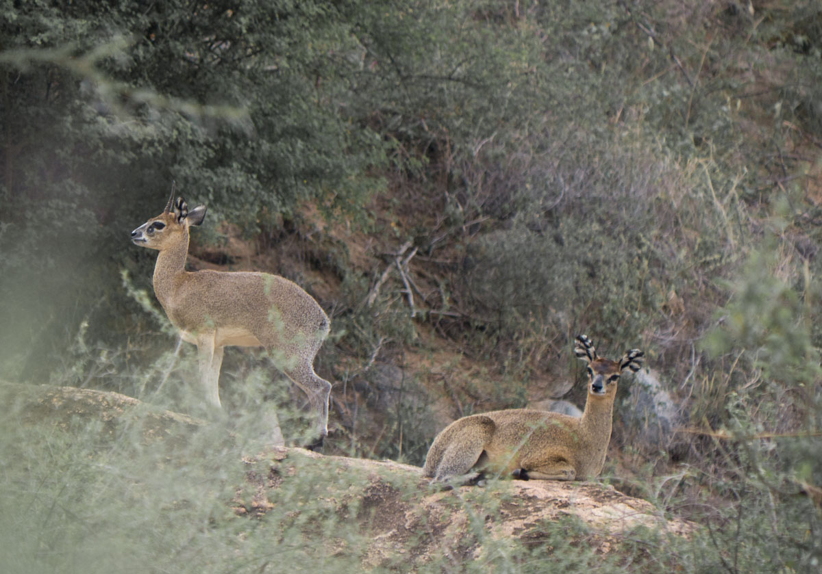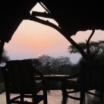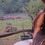 We tried not to answer that question as we left for the Great Outdoors. We drove for about an hour, spotting elephant, giraffe, antelope, and dik diks all along the way. Then Mark proposed we get out and walk the last little stretch. Justin, the park ranger assigned to us, was armed and would escort us and it wasn’t really very far to the camp site. Mind you, it was now dusk—the precise time when predators emerge and everything else goes into hiding. All of my senses were tingling as we hopped out of the Rover and began to stroll down the middle of the empty riverbed. Just two nights earlier we had seen a leopard walking this precise path. Were we crazy?