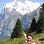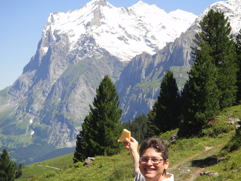 Figuratively, at least. Soon, our bellies quietly rumbled and we all began looking ahead to lunch at the trail’s end. It was after 1:30 and breakfast was four hours and three (alpine) miles ago. Then, we experienced something akin to a desert wanderer’s oasis mirage, only it was real! There, in the middle of the mountain trail, was a solar-powered small refrigerator filled with local cheese for sale. A small sign in several languages told us that it was self-service. We grinned, made our selection, and deposited our Swiss francs in the jar.