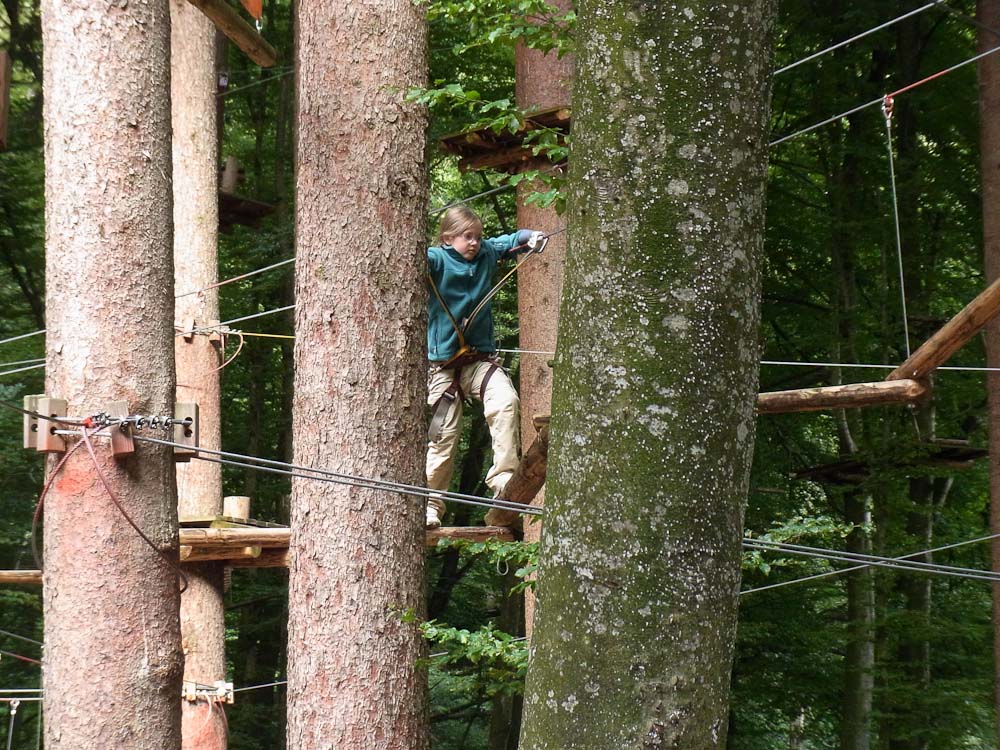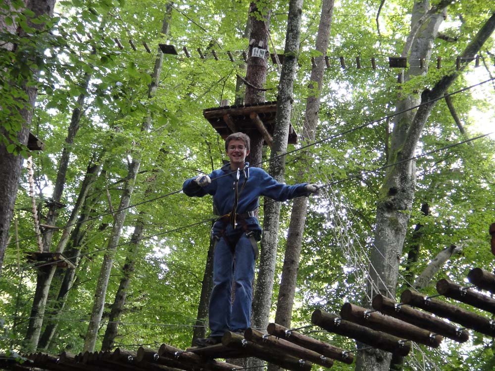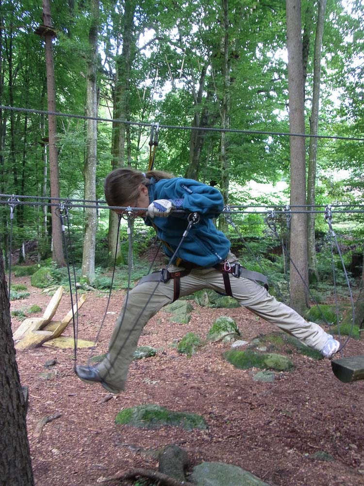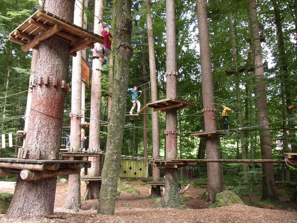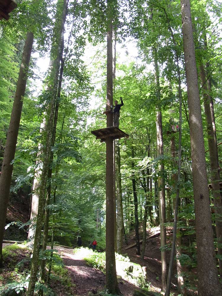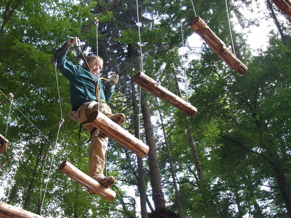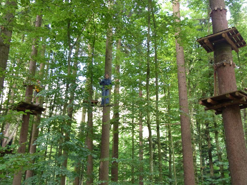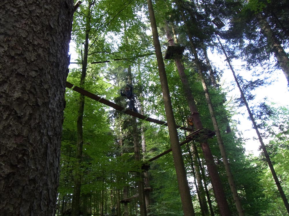 After our snack we followed my Dad as he TRIED to find the ropes course. As we traveled in endless circles of misery and exercise around the city, my mom and I amused ourselves by watching the paragliders flying and landing in the park. Now, for most other countries you would be jumping off a tall tower or structure, in Switzerland you jump off the top of a mountain. We asked for directions to the Ropes Park, or Seilpark in German. The lady we asked pointed in the right direction and soon we were at the front desk of the ropes course.