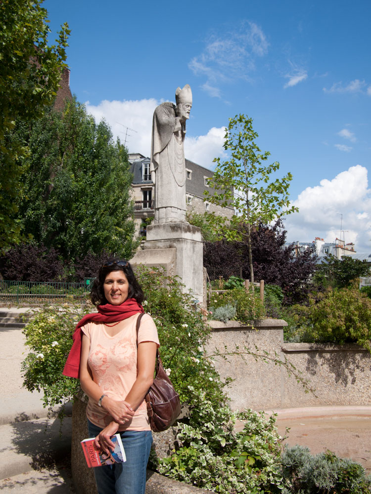 Saint Denis was the first Bishop of Paris, sent there in 250AD to convert the locals to Christianity. It was a tough job because the Romans controlled the area completely - they built a thriving town Lutece that later became the heart of Paris - and they were persecuting Christians all over the world (see Carter's Underground City posting). After Bishop Denis succeeded in converting a number of people to Christianity, the Romans marched him to the tallest nearby hill and chopped off his head. Instead of dying, the devoted man picked up his own head and kept on preaching! He walked for six miles before death. The hill where this event happened is called Montmartre, a name possibly going all the way back to the Roman name, Hill of Mars. (P.S. The place where St. Denis reputedly ended his walk and collapsed is now the site of the St. Denis Basilica, which is also famous - it is where the Kings of France are buried).