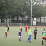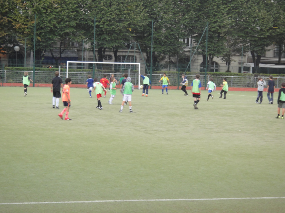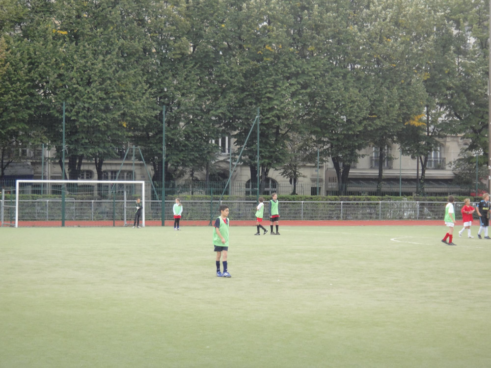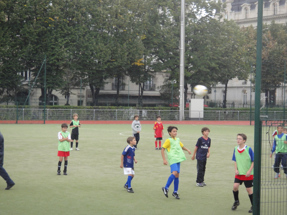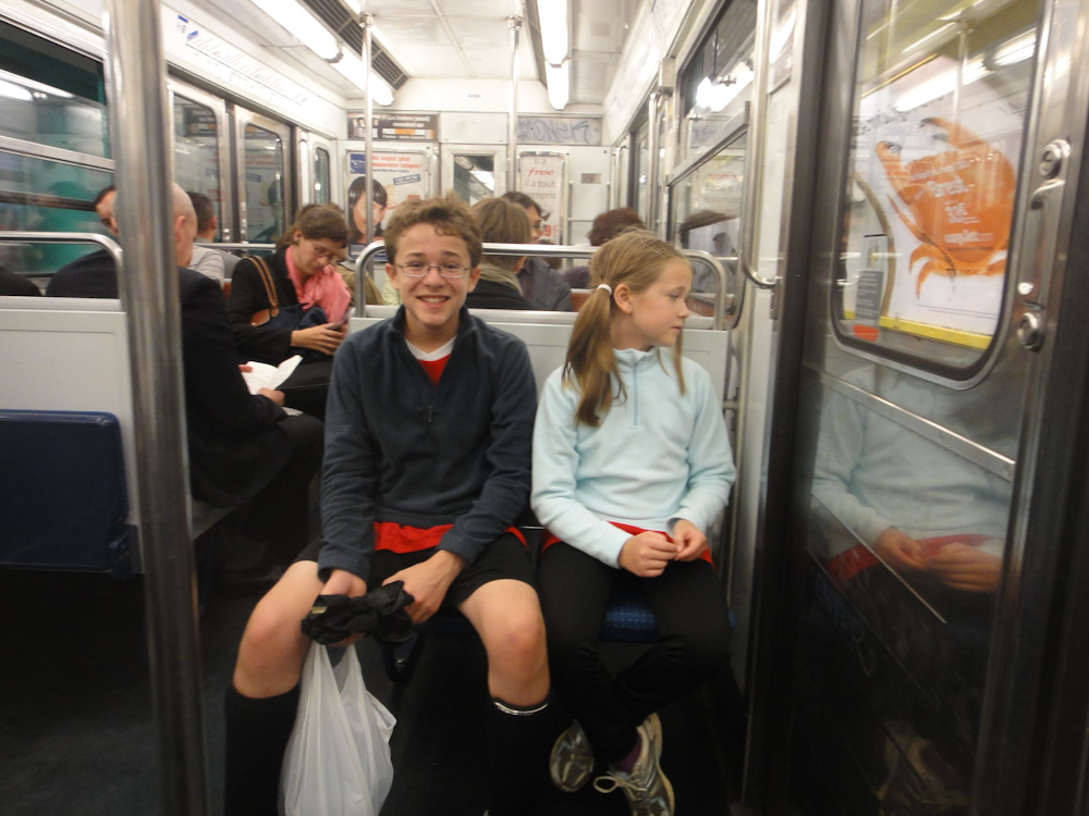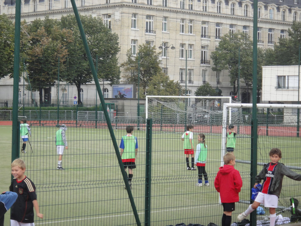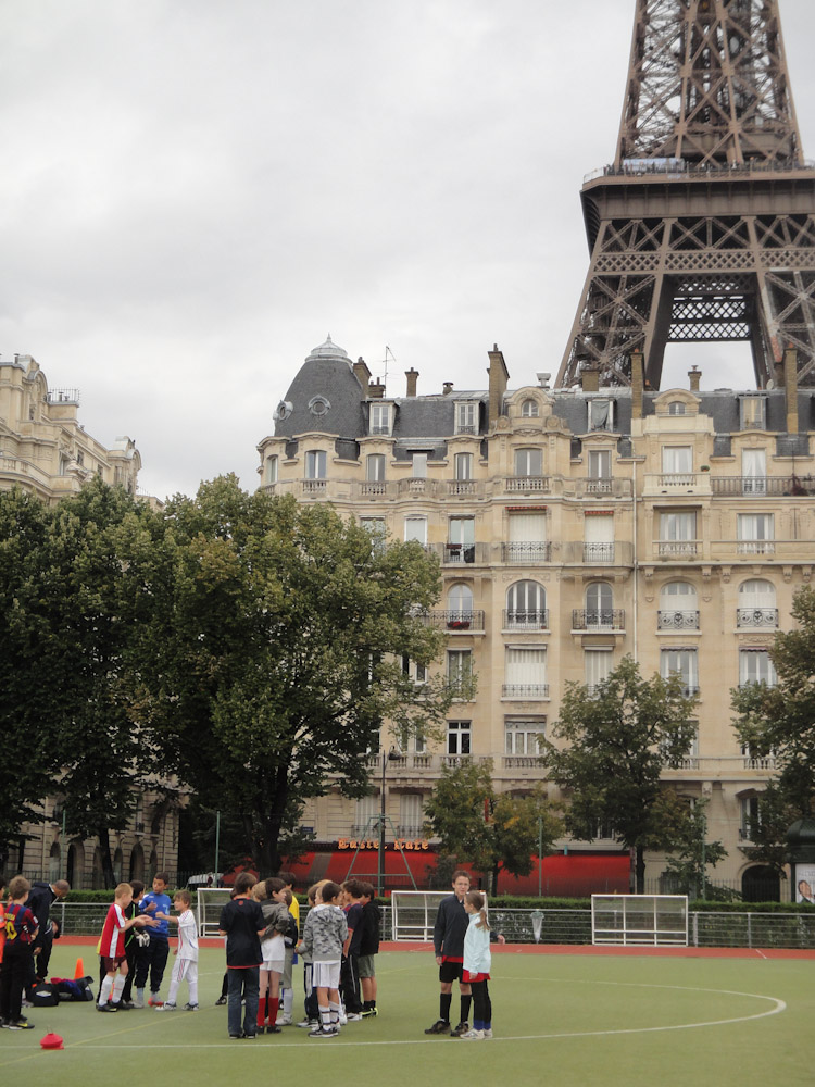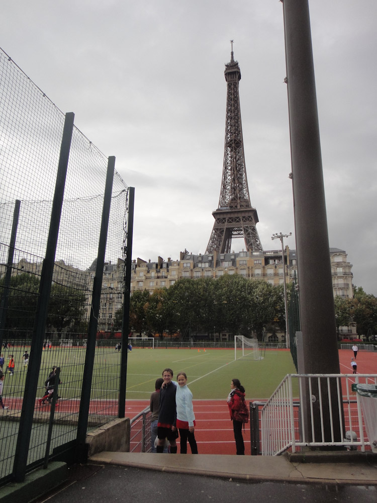 When we got there (after about an hour of wandering around in the rain looking for it) we were soaking wet. Mom got the attention of the coach and spoke to him in French. He asked us in English if we wanted to play. Of course we said yes. That was when we figured out that there were 202 kids, 201 of those kids were BOYS!