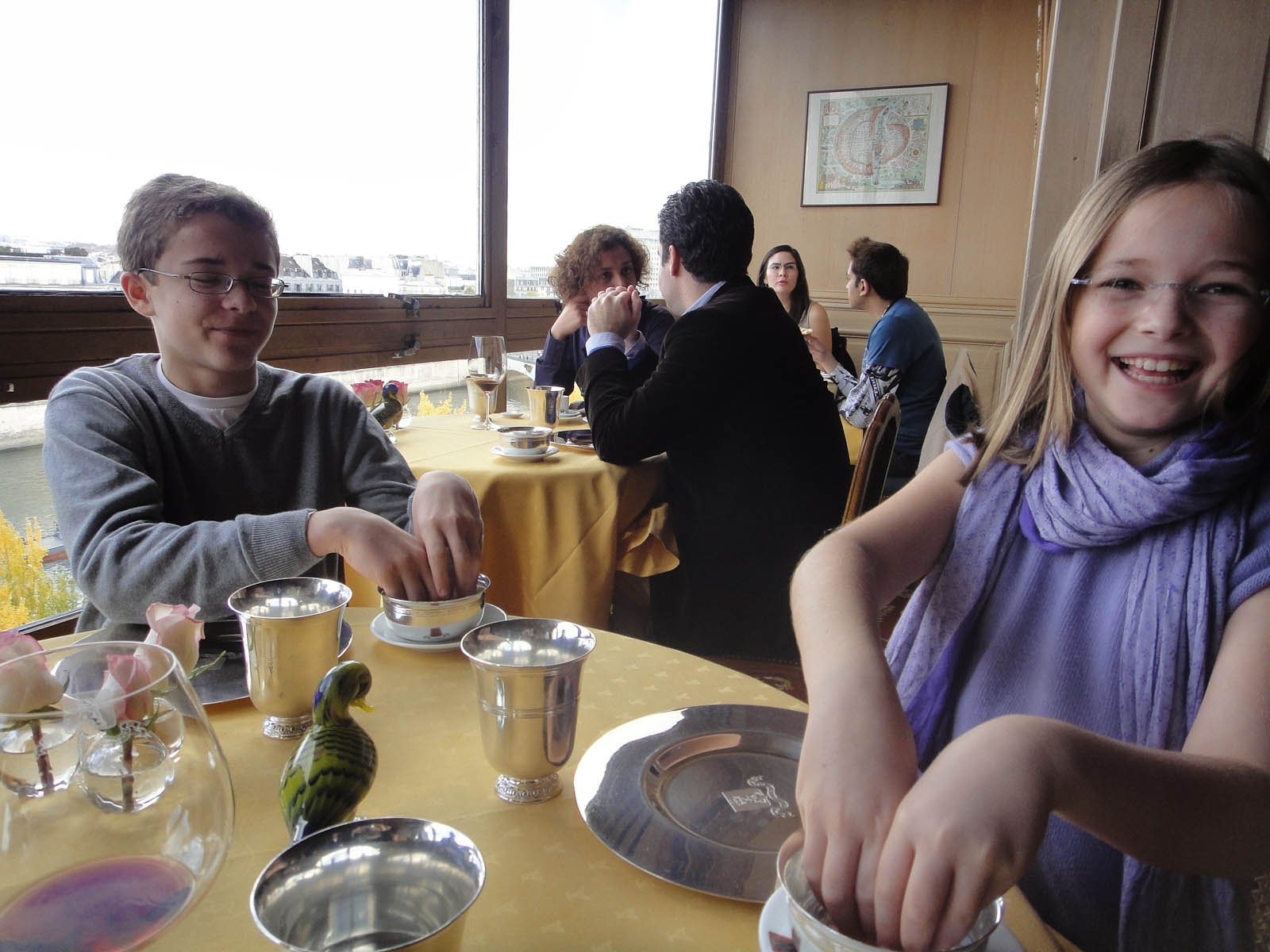A few days ago we went to La Tour d’Argent, or the “Tower of Silver.” We entered the tower and were greeted by a woman in a black dress and a man in a suit. The woman took our coats and the man ushered us in to a fancily decorated waiting room. We sat on green chairs and looked around; there were many cool statues of people made of different ordinary and unusual objects mashed together.