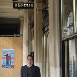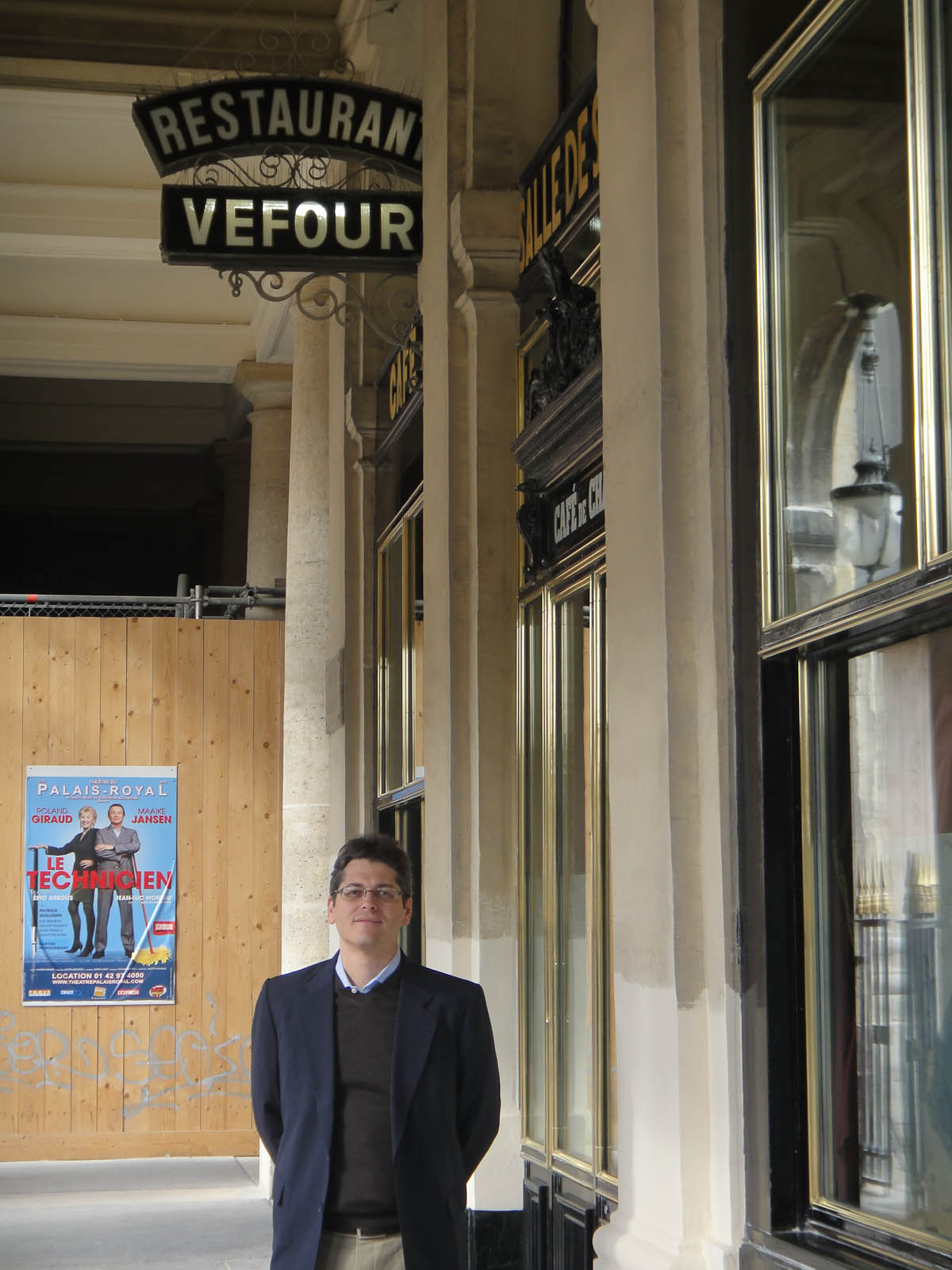 Next chronologically comes Le Grand Vefour; Russ and I went here for lunch to celebrate his birthday at the suggestion of Chris Min. The restaurant first opened in 1784 under the name “le Café de Chartres” and, excepting the war years of 1905-1947, has been in service ever since (it changed ownership and its name in 1820). It is located in the arcade of the Palais Royal, about a fifteen minute walk from where we live. These gardens were originally the private playground of the royals; we were told that the young Louis XIV played here as a child. It is easy to imagine a young prince cavorting among the allies and making mischief with the water fountain.