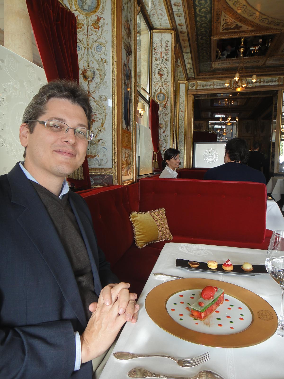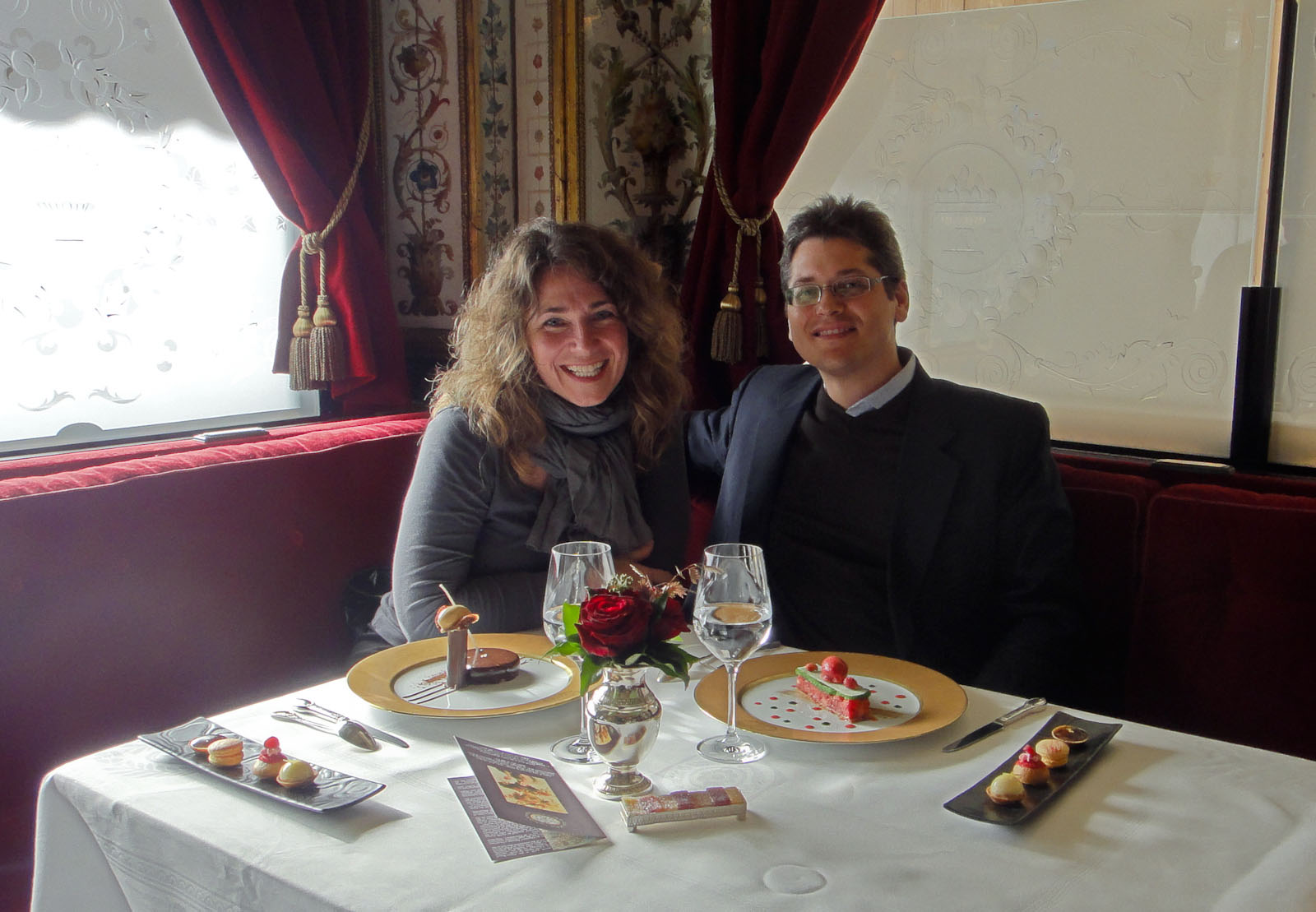The restaurant itself has some of the most stunning décor we have seen. The walls are covered in mirrors and painted glass, reminiscent of a mini-Versailles; the twenty or so tables are actually booths upholstered in red velvet which line the perimeter of the room. Over the years, the restaurant became “the” place for the intellectual and political elite to dine: Victor Hugo, Georges Sands, Colette, Sartre, Simone de Beauvoir, and Napoleon and Josephine Bonaparte were among the regulars. Today, tiny brass plaques mark each of their seats. When we visited, Russ had Colette’s privileged post. In 1983, the restaurant was officially classified as an historic monument. That same year it was acquired by the current owners, the Tattinger family of French champagne fame. Le Grand Vefour was awarded three Michelin stars in 1953, reduced to two three decades later, and–under the new culinary leadership of chef Guy Martin–went back to three stars in 2000. The latest three-star run was broken in 2006 and today the restaurant is classified as a two-star destination.
