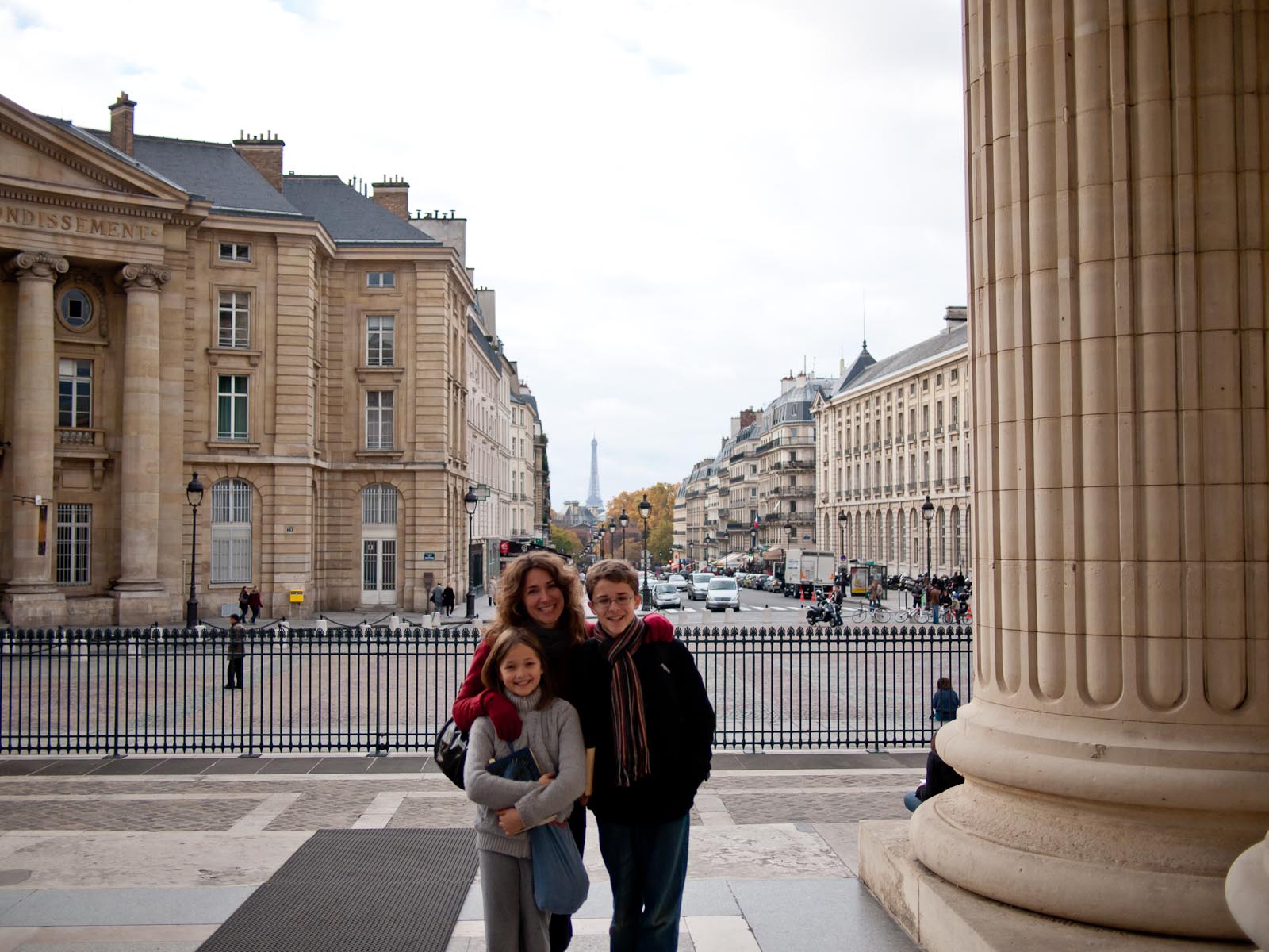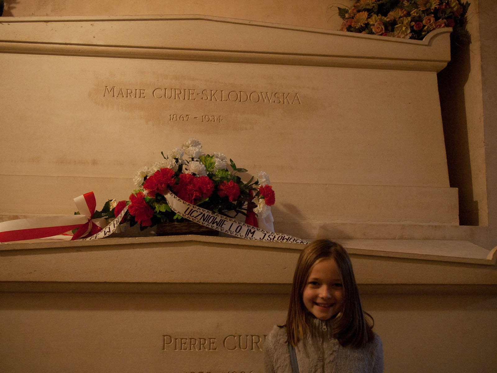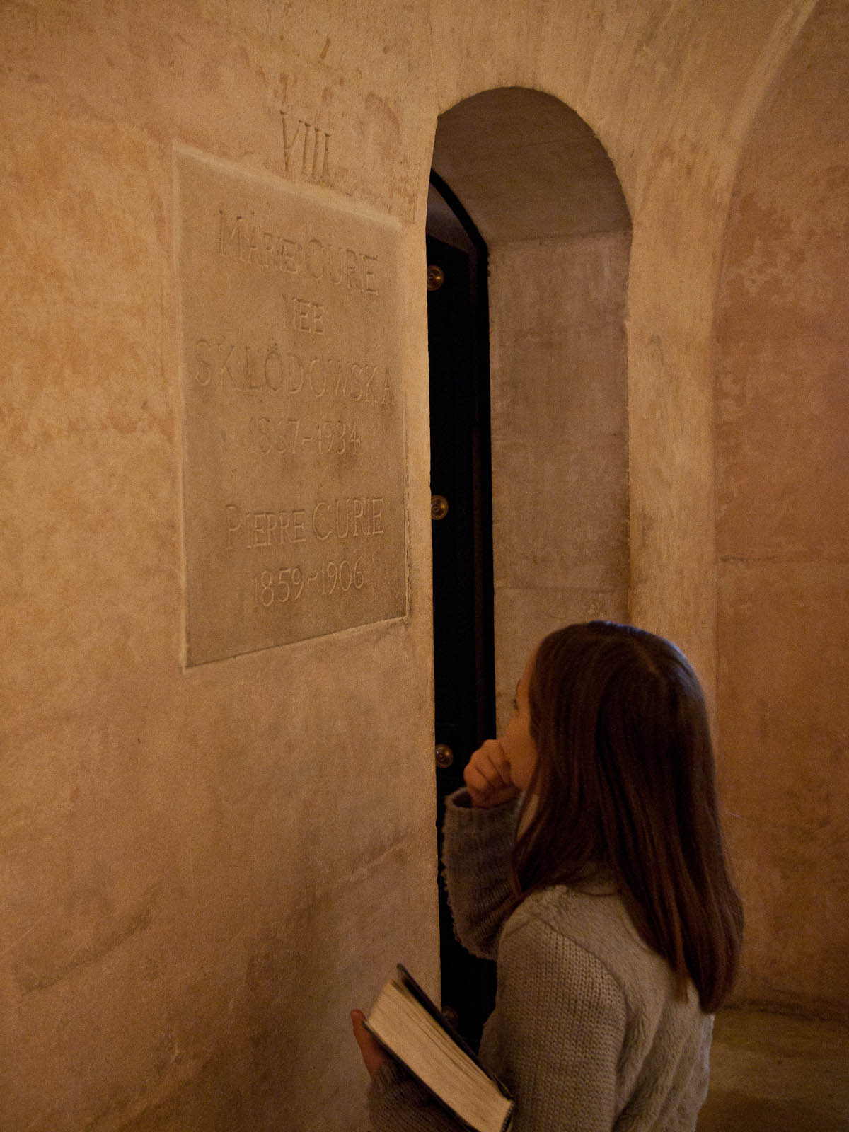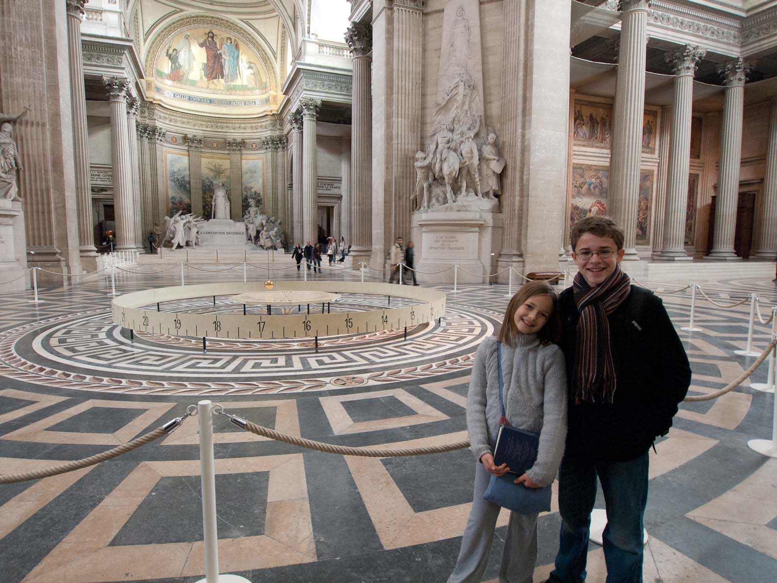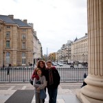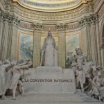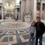 - The Pantheon. This visually impressive monument sits atop a hill in the Left Bank where its gravitas adds to the weight of the Sorbonne University area. We had walked past the Pantheon building many times yet never entered before. Inside we were awed by grand architecture blending ancient stone columns with ornate decorations (it is deemed “the first” neoclassical building). The enormous dome here is where Foucault first constructed his pendulum, which showed that the earth rotated because the direction of the swing would gradually shift throughout the day. Public displays like this helped to usher in the shift from religious mysticism to scientific enlightenment. A re-creation hangs there today. The building owes its origin to Louis XV who was suffering from an illness and swore to build a giant church in honor of St. Genevieve if he were cured. After the French Revolution it was transformed into a secular building and so it is decorated with monuments and paintings celebrating the change from monarchy to democracy. After the death of Victor Hugo, the French decided to make the Pantheon into a burial place for its greatest citizens – writers, scientists, leaders, soldiers and artists. The bodies of Voltaire and Rousseau were exhumed and brought here with great celebration as starters and there are now some 300 great citizens buried here. Katherine was pleased to discover that Marie Curie is here – one of only two women to be admitted to the Pantheon, and the only one to be brought here on the strengths of her own accomplishments. Carter was touched to find the actual tomb of Victor Hugo, author of the story that inspired Les Miserables. And in a nod to DI, in 2002 the remains of Three Musketeers author Alexandre Dumas were brought here, draped in a cloth that reads “Un pour tous, tous pour un.” As we left we noticed the sign above the entrance of the Pantheon reads “For Great Men Our Country is Grateful”. It must be an inspirational challenge to the thousands of university students who walk by here every day.