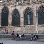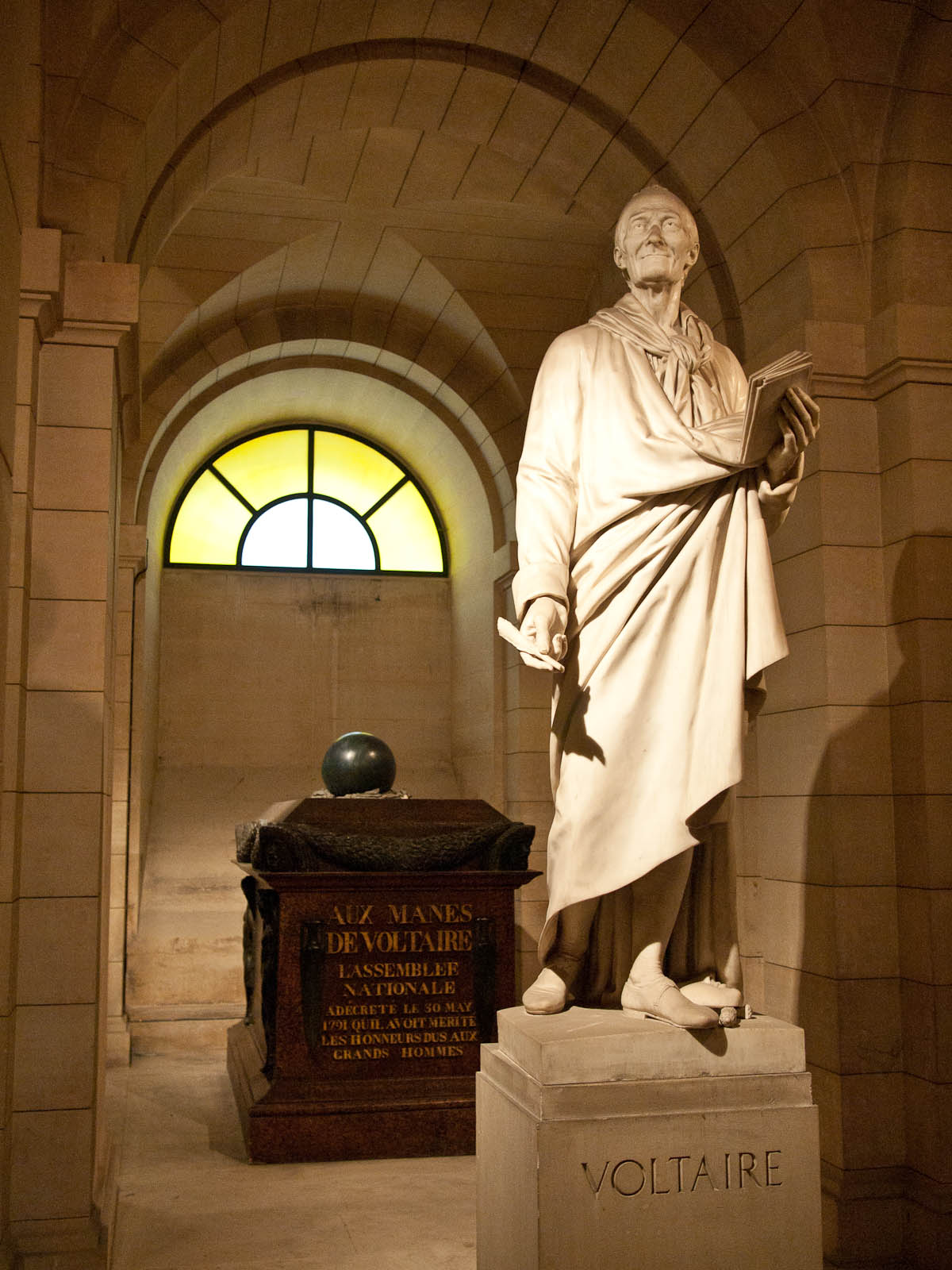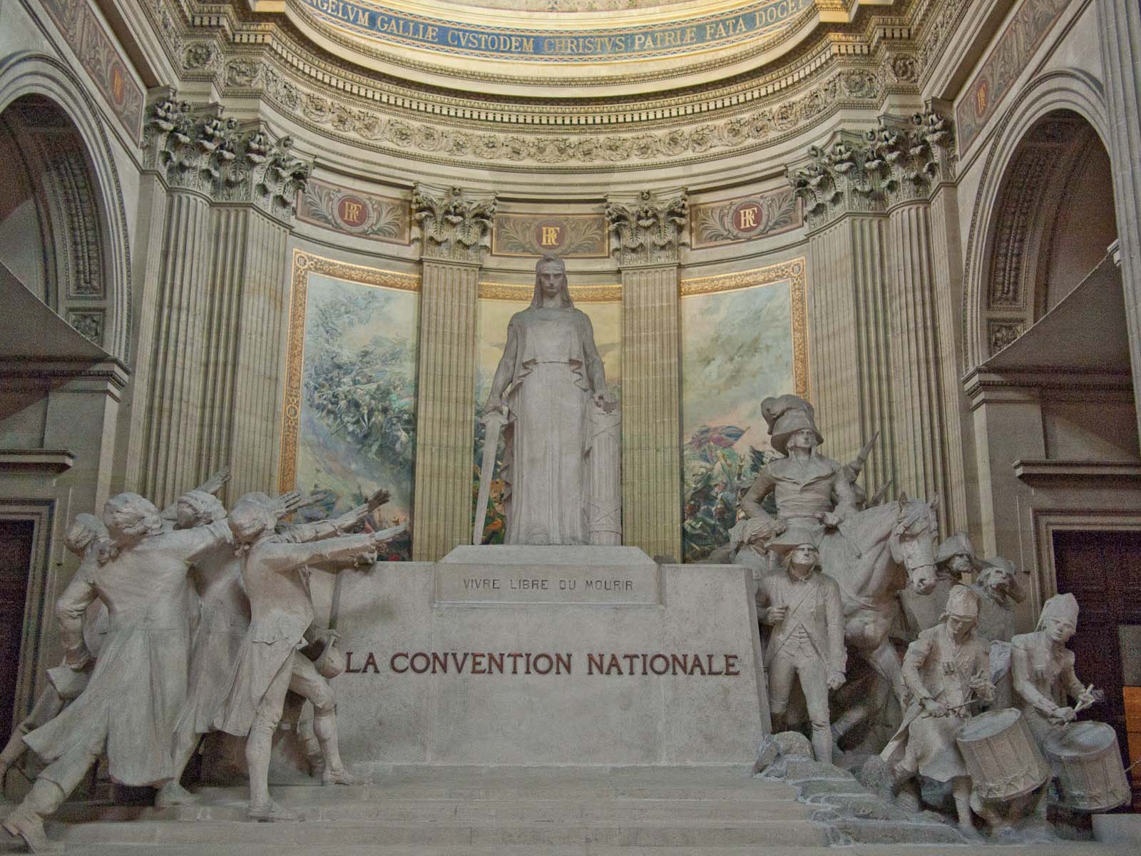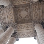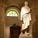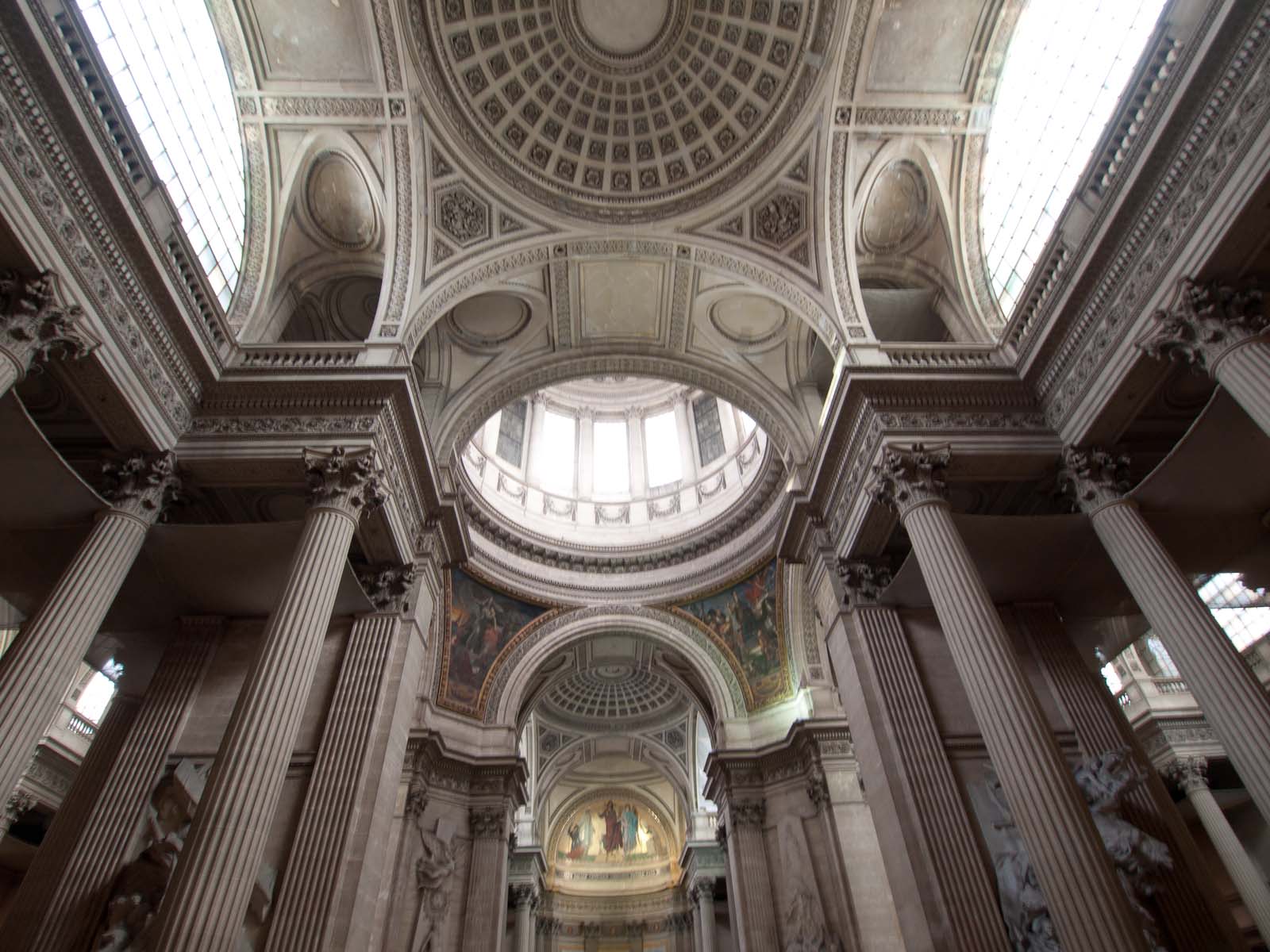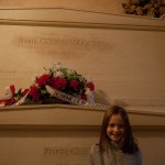 - The Pantheon. This visually impressive monument sits atop a hill in the Left Bank where its gravitas adds to the weight of the Sorbonne University area. We had walked past the Pantheon building many times yet never entered before. Inside we were awed by grand architecture blending ancient stone columns with ornate decorations (it is deemed “the first” neoclassical building). The enormous dome here is where Foucault first constructed his pendulum, which showed that the earth rotated because the direction of the swing would gradually shift throughout the day. Public displays like this helped to usher in the shift from religious mysticism to scientific enlightenment. A re-creation hangs there today. The building owes its origin to Louis XV who was suffering from an illness and swore to build a giant church in honor of St. Genevieve if he were cured. After the French Revolution it was transformed into a secular building and so it is decorated with monuments and paintings celebrating the change from monarchy to democracy. After the death of Victor Hugo, the French decided to make the Pantheon into a burial place for its greatest citizens – writers, scientists, leaders, soldiers and artists. The bodies of Voltaire and Rousseau were exhumed and brought here with great celebration as starters and there are now some 300 great citizens buried here. Katherine was pleased to discover that Marie Curie is here – one of only two women to be admitted to the Pantheon, and the only one to be brought here on the strengths of her own accomplishments. Carter was touched to find the actual tomb of Victor Hugo, author of the story that inspired Les Miserables. And in a nod to DI, in 2002 the remains of Three Musketeers author Alexandre Dumas were brought here, draped in a cloth that reads “Un pour tous, tous pour un.” As we left we noticed the sign above the entrance of the Pantheon reads “For Great Men Our Country is Grateful”. It must be an inspirational challenge to the thousands of university students who walk by here every day.
