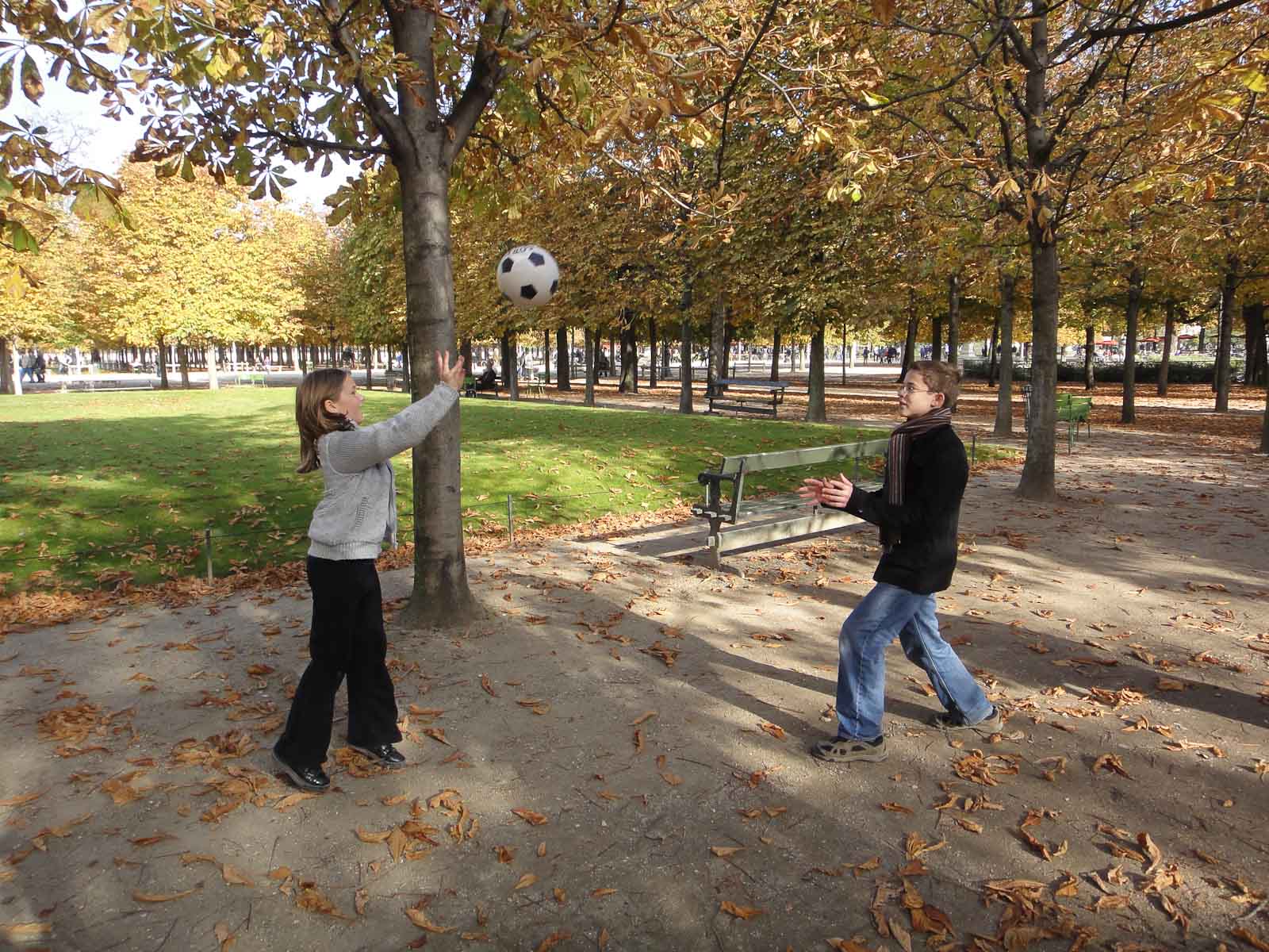 - Playing in the Tuileries. Paris has turned to autumn colors, and the leaves are down in the nearby Tuileries park. One day the factors all aligned and the whole family had a few free hours at mid-day with no tours and no classes, so we grabbed our (pretend plastic) soccer ball and headed out for fresh air. The weather was perfect. Our mocked up soccer field was spread over rows of trees, who acted as defensemen! It was bumper soccer and a mad scramble ensued, boys v. girls. (No gentleman would ever say who won the game of course). This was followed by steaming hot crepes at the local stand in the park. At this point we had tried all the flavors except the disturbingly named “milk jelly” so of course we had to order that – can you believe confiture du lait turns out to be a buttery, salty caramel paste version of Nutella? Note to self: milk jelly = good. We sat for a long while after that just talking and enjoying the sunshine. It was a great fall day.