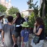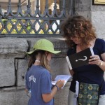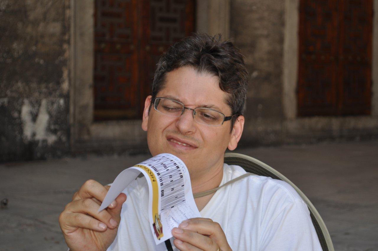 We began to work on the puzzle which was a small black square of paper filled with letters. In the corners there were seemingly useless white bubbles. My dad found the words “Beck Street” and we all wasted a good 20 minutes looking for Beck Street on our THREE maps (after 5 minutes we got 2 more from our hotel). After 20 minutes we got another call from…The Mystery Man. He asked if we were done yet, and when we told him no, he told us to keep at it. About 2 minutes after the second call, a man came out from behind a truck and took a photo of us before disappearing back from whence he had come. We continued searching for another 10 minutes before the Mystery Man called again. This time he told us that the white bubbles go with the letters and then let us continue on. We put the proper, or so we thought, letters in the boxes and tried to unscramble the letters. Ten more minutes later the poor Mystery Man had to call again. We told him we were trying to unscramble the letters and he replied that there was no un-scrambling needed, and then we had our photo taken, again. Ten more minutes later, The Mystery Man had to intercede again. This time, it was not a call but a text message. He told us every other letter of his location and we were able to guess where he was. We headed over to the Imperial Gate of the Topkapi Palace (where the Sultans used to live) and saw a man wearing sunglasses and a T-shirt that had a big question mark on it.
