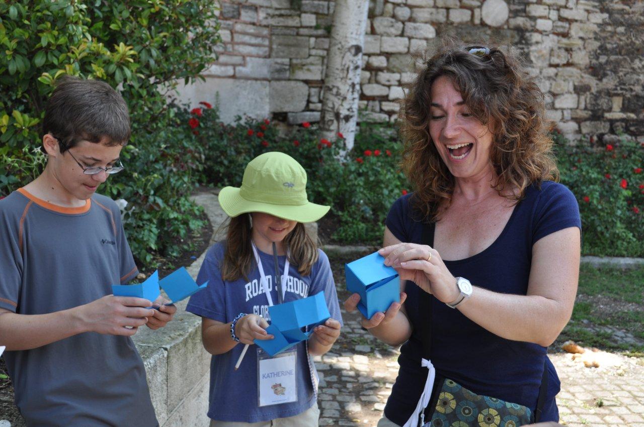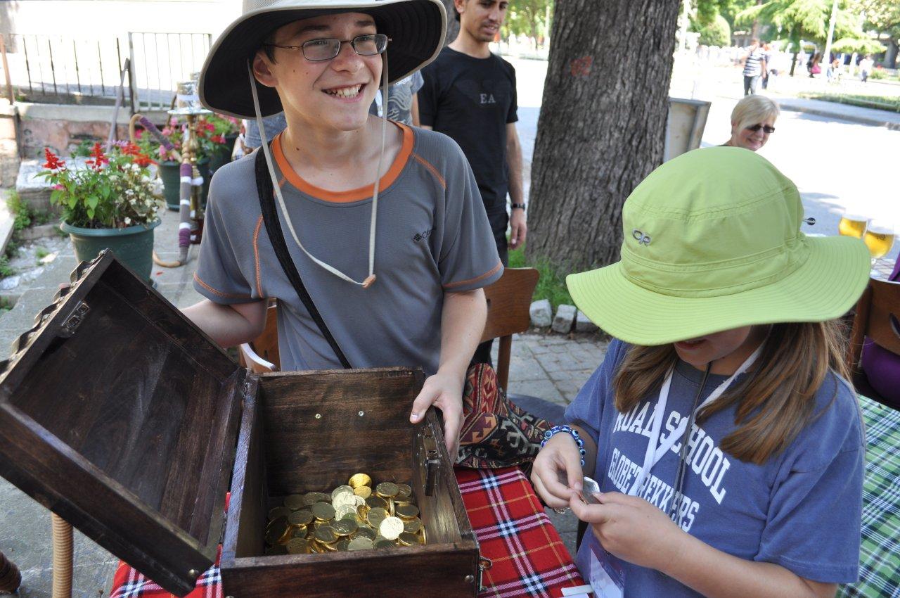We then went to the various locations, which included the main sites of the Hagia Sophia and the famous Hippodrome, took our pictures, and headed to the final meeting place. Earlier at the Blue Mosque, Katherine had been given a key. Now she was going to be able to use it. Everyone from the Café Sibil was there and, on a table, there was a big wooden treasure chest. Katherine tentatively inserted the key and opened the chest and—lo and behold!—it was filled with chocolate gold coins!