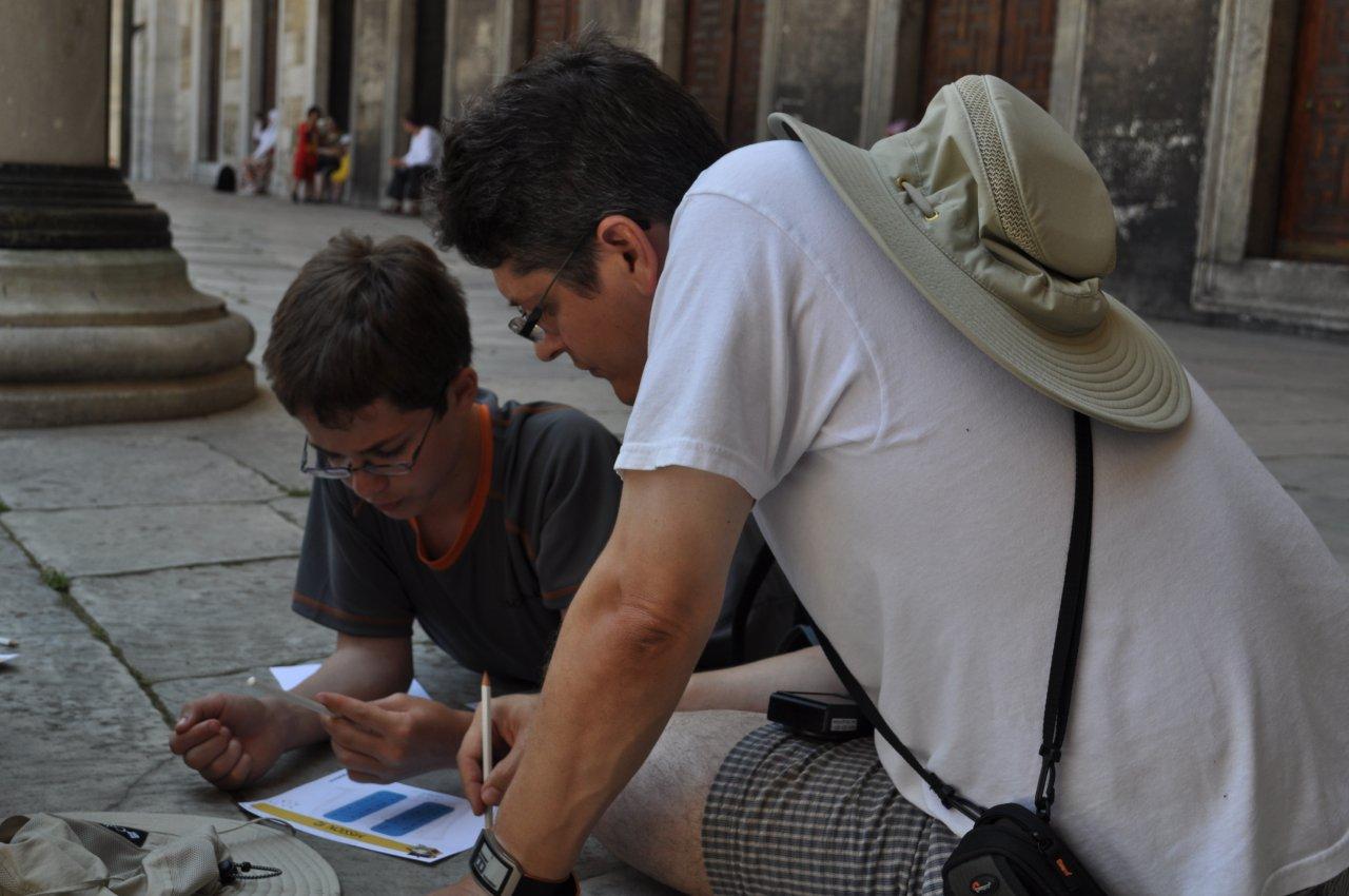 Dad went to the front desk and came back with two envelopes. The first envelope had a strange puzzle, a map and a cell phone. In the second envelope there were four nametags, each with one of our names on it. We went outside and sat down underneath a tree where we were surprised by a mystery caller. The cell phone we had been given, suddenly and without warning, blasted out an exotic Turkish ringtone, causing us all to jump. My dad answered the phone and a voice told him to solve the puzzle.