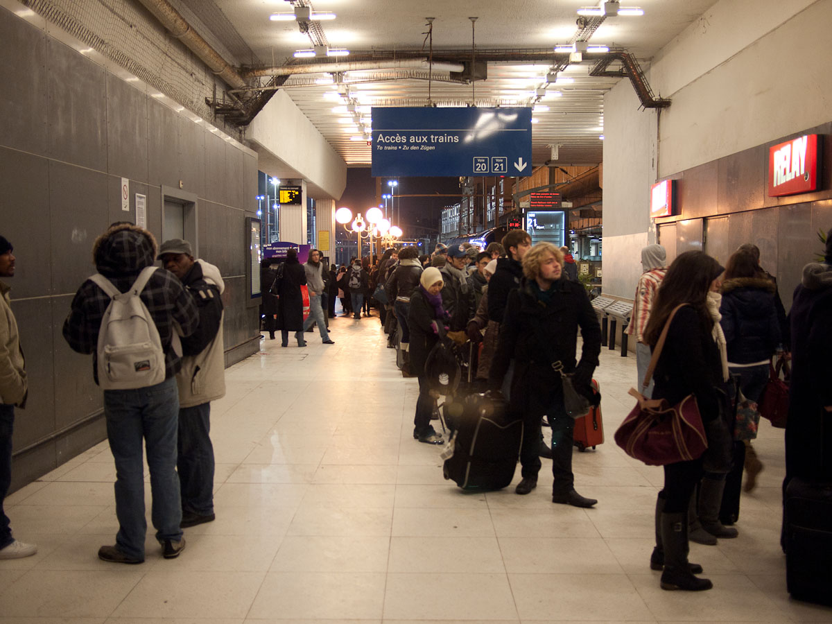 We considered a number of strategies for circumventing the line or finding alternate transport, but as luck would have it, Eurostar had managed to clear its tracks enough to avoid cancelling its morning trains. Eurostar was making no attempt to look at seat assignments; if and when trains arived from London, passengers from the line were seated first-come first-serve and the train rushed back out. There were delays due to slow speeds but all or most trains were expected to run.
