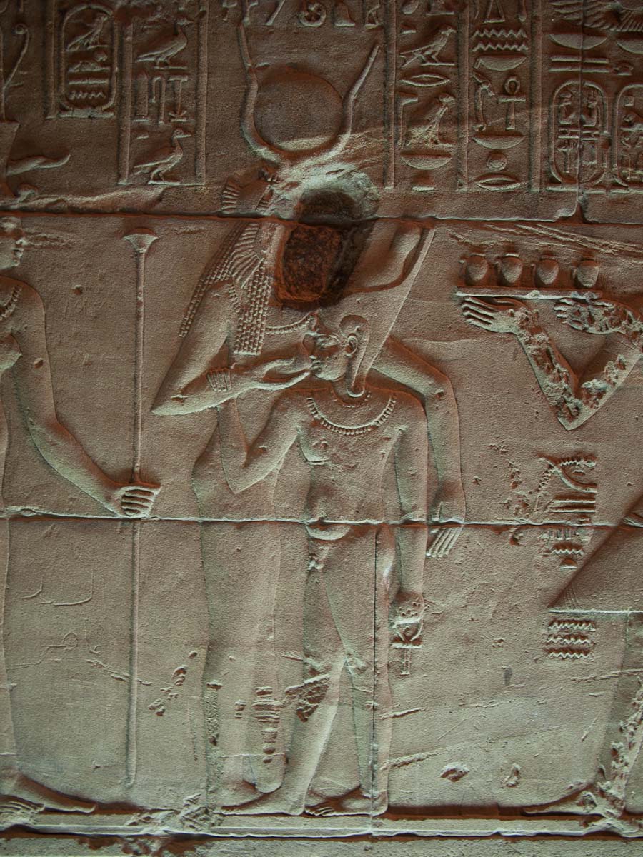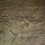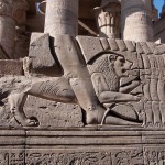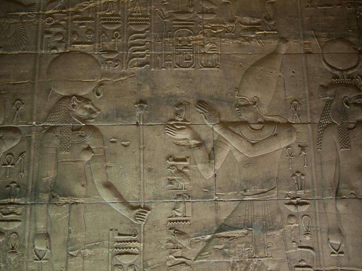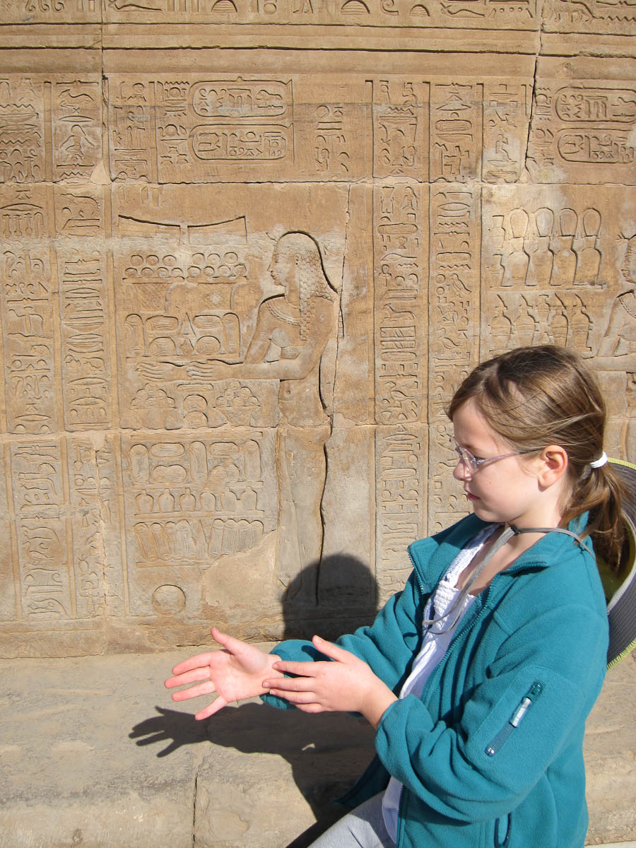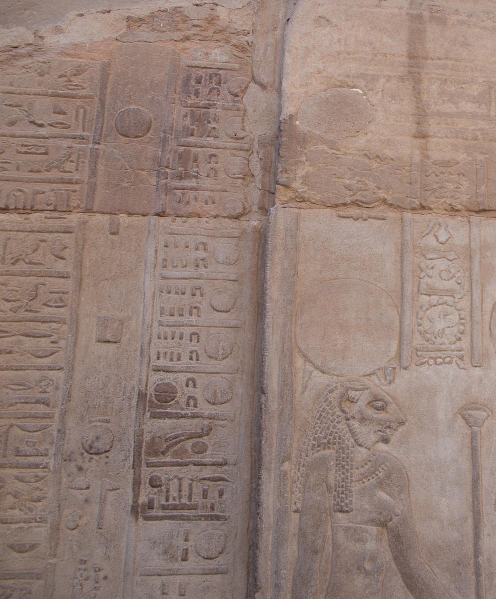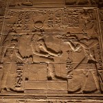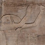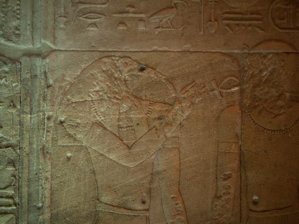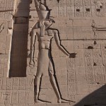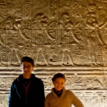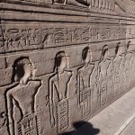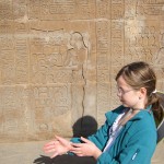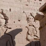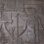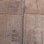 We looked up and saw that the hallway’s ceiling was blackened from fire, which we were told was because the Christians used it as a kitchen. We also learned that each column represented one hour of the day. We continued onward and explored the rest of the temple, looking at the various chambers and passageways. There was one wall which depicted Horus and Sekhmet battling Set, who was depicted as a hippo. There were many pictures of the same scene with minor variances in positions, showing the many times that Horus and Sekhmet had to try and vanquish Set.