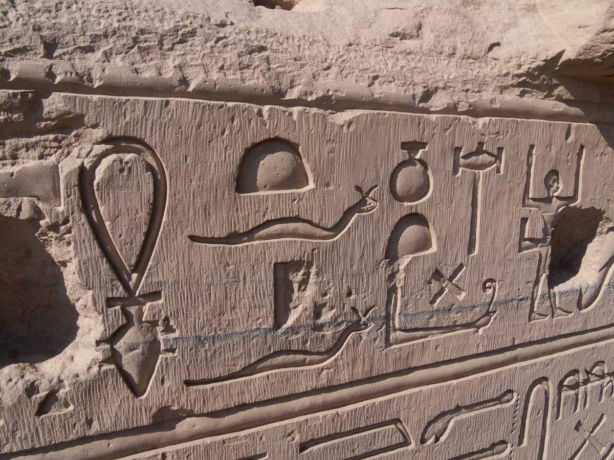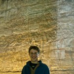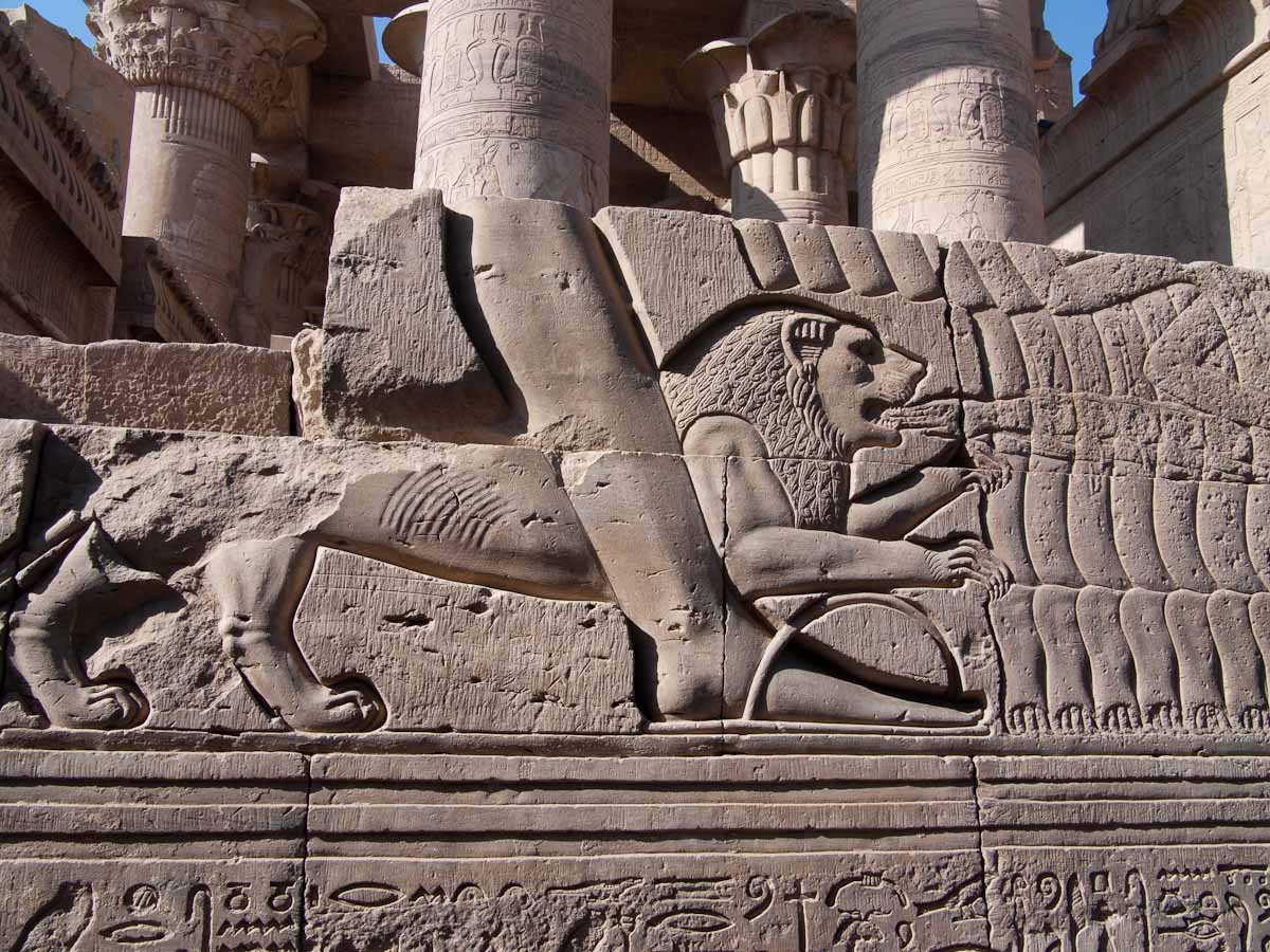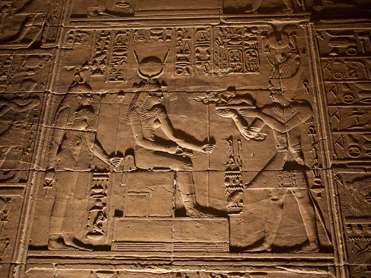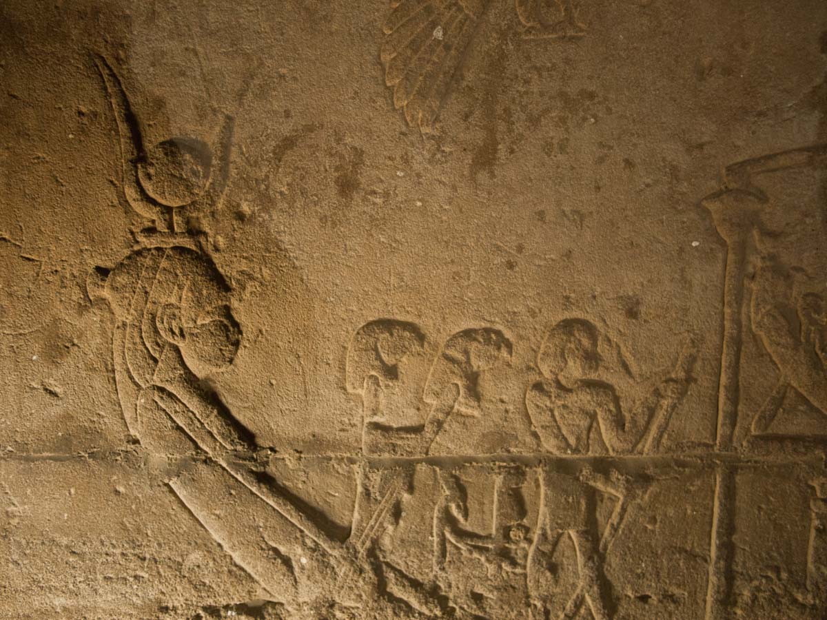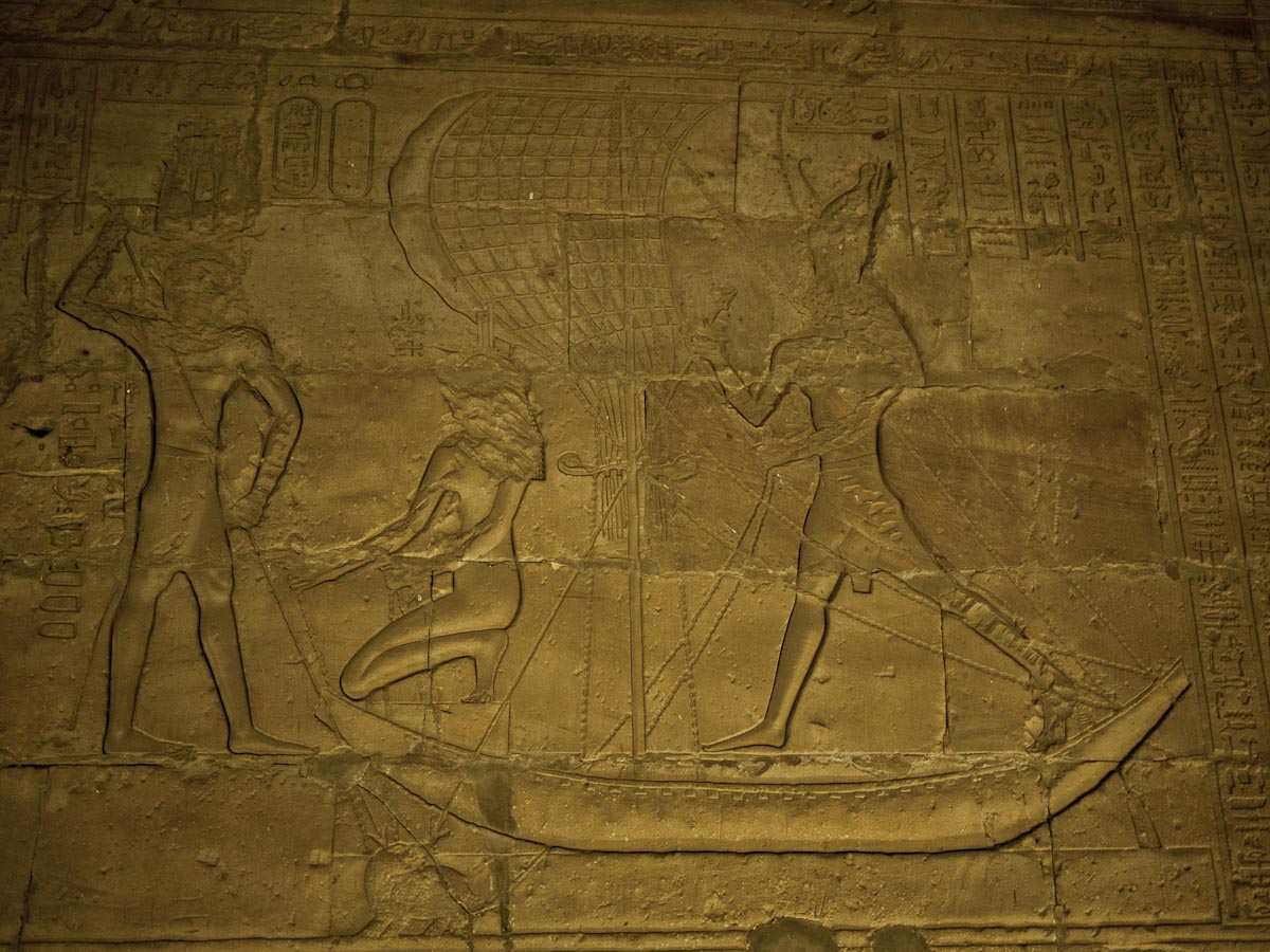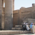 We looked up and saw that the hallway’s ceiling was blackened from fire, which we were told was because the Christians used it as a kitchen. We also learned that each column represented one hour of the day. We continued onward and explored the rest of the temple, looking at the various chambers and passageways. There was one wall which depicted Horus and Sekhmet battling Set, who was depicted as a hippo. There were many pictures of the same scene with minor variances in positions, showing the many times that Horus and Sekhmet had to try and vanquish Set.