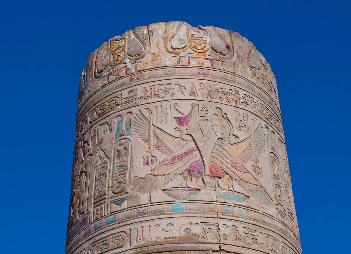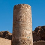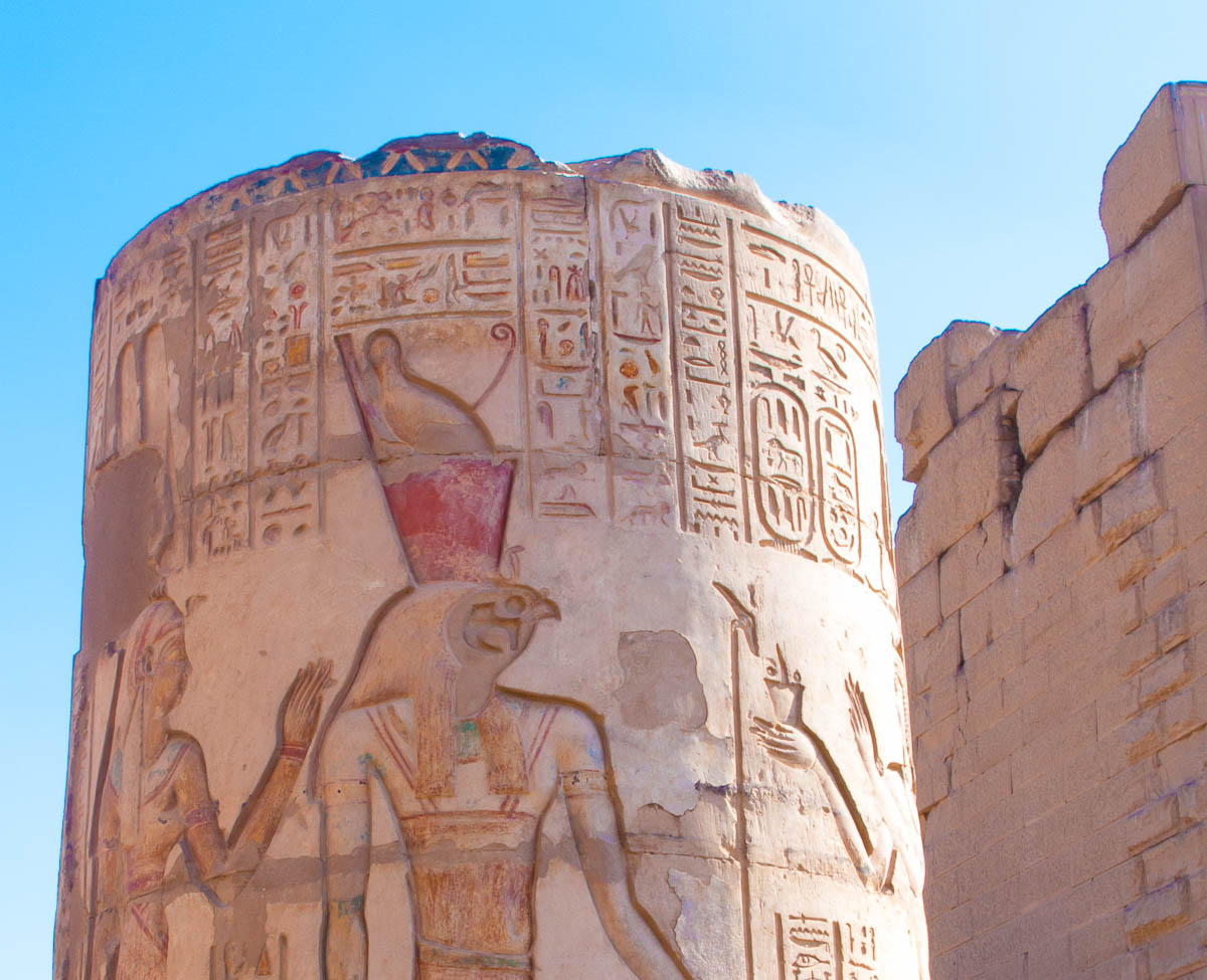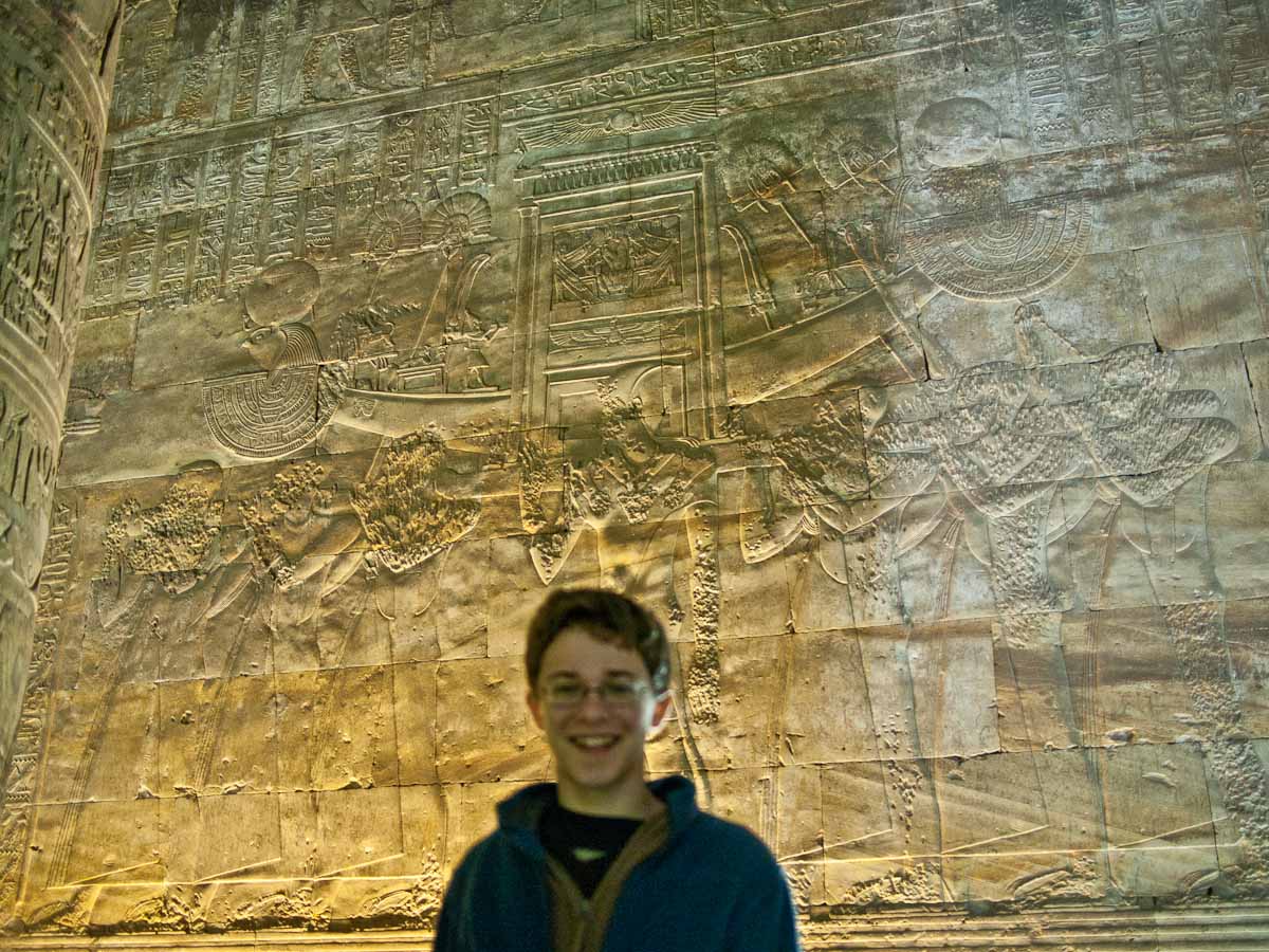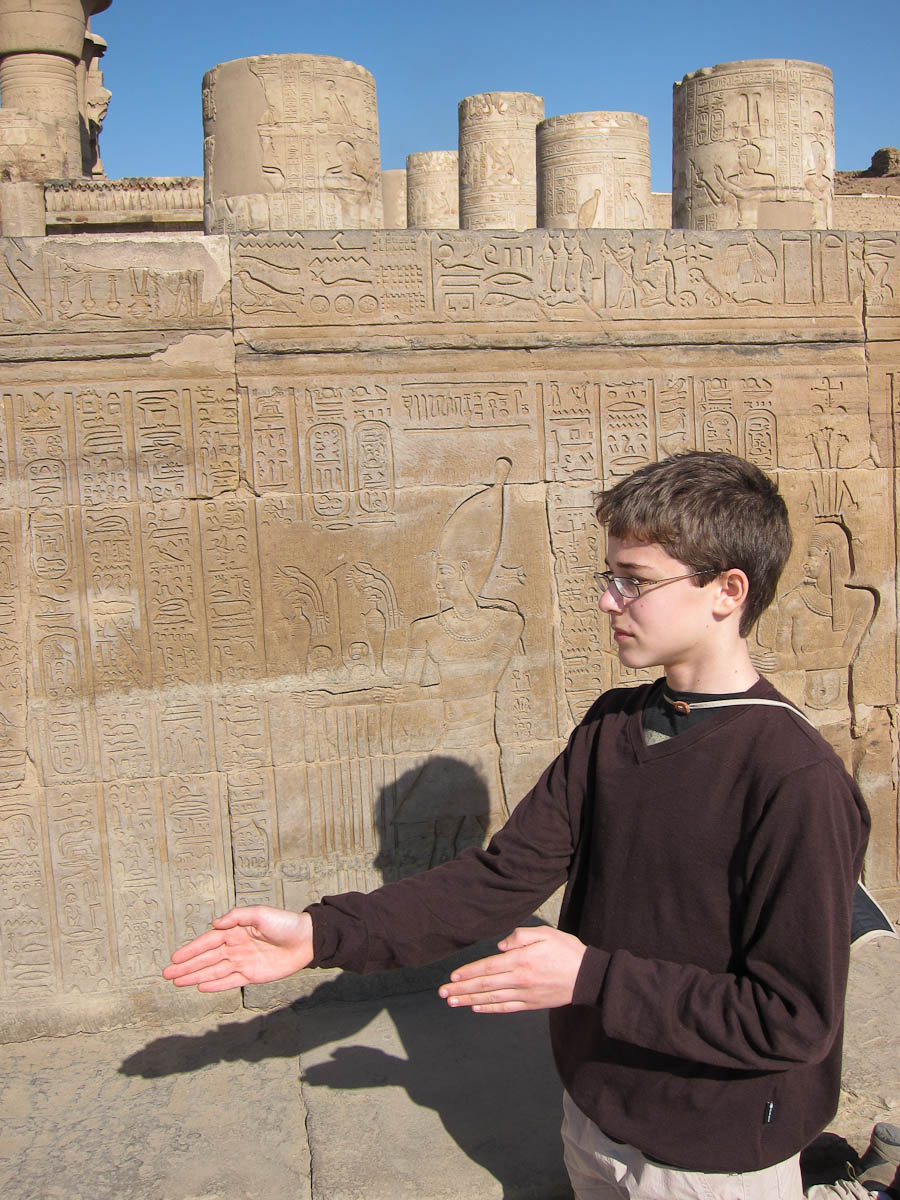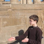 We entered the temple and found ourselves in a big courtyard. Columns lined the perimeter, their crowns alternating design between papyrus flower, lotus, and papyrus reeds. This indicated that the temple was made in the roman era. In fact it was built by King Ptolemy the 1st, one of Alexander’s generals. After Alexander died, King Ptolemy the 1st went to Egypt and began the line of the last pharaohs, including Cleopatra, who is actually descended from Macedonians. The Egyptians did not want to grant him eternal life by carving his name in a cartouche, so they left all the cartouches blank. Of course, Ptolemy didn’t realize it, because only the Egyptians had that tradition. Later though, he dressed like an Egyptian pharaoh, and after a while the Egyptians accepted him and went back and carved his name in a few cartouches.