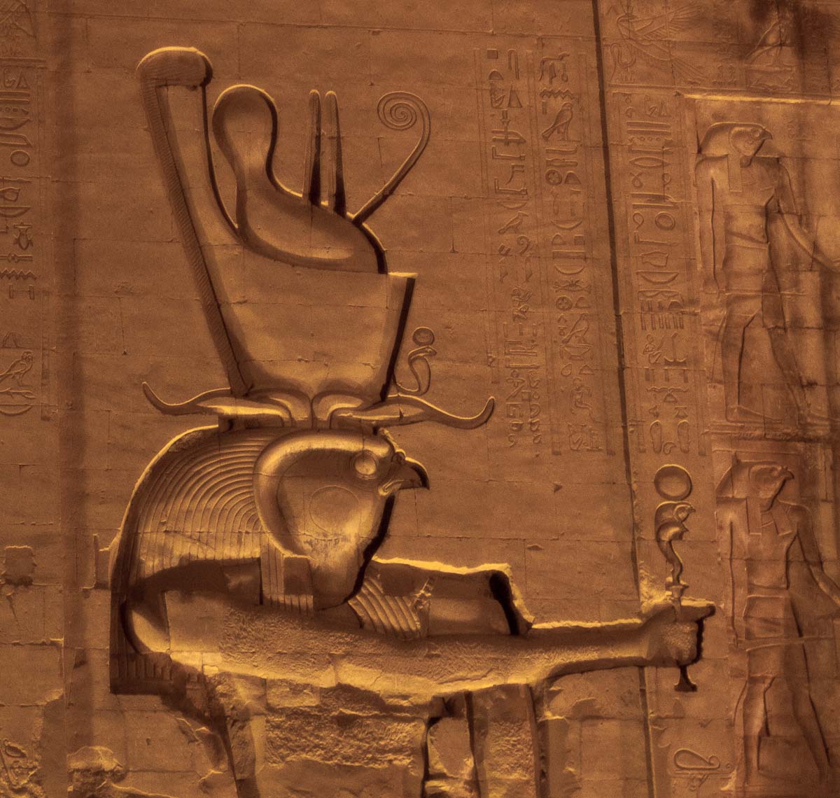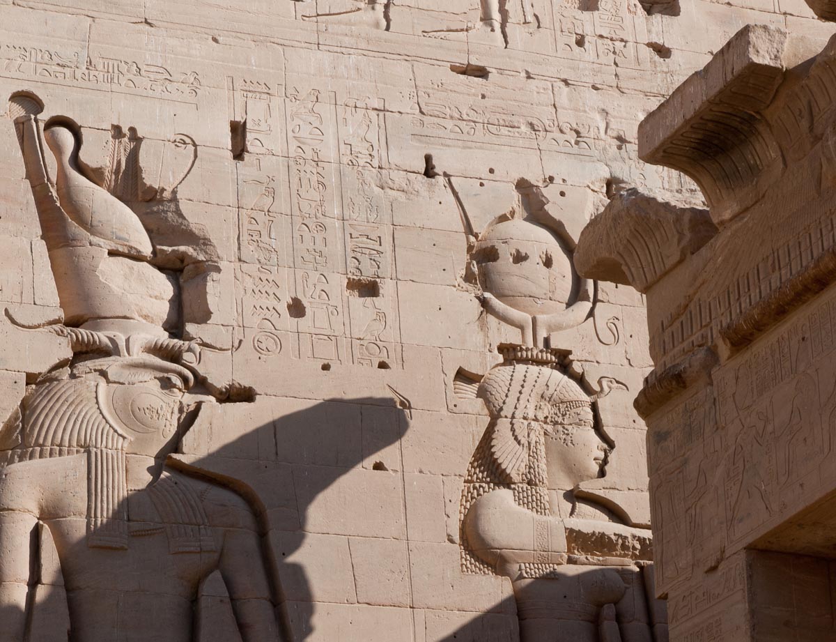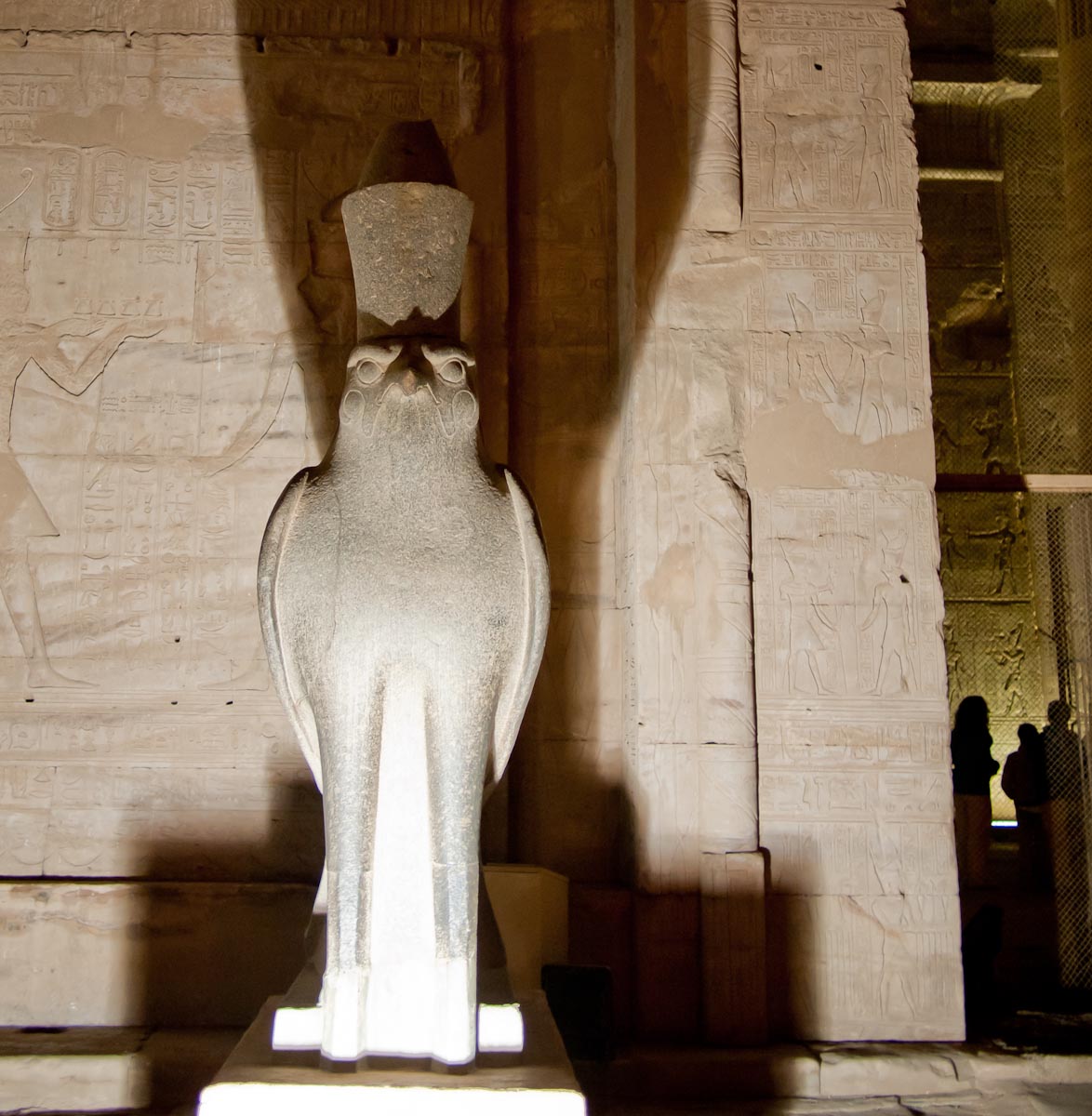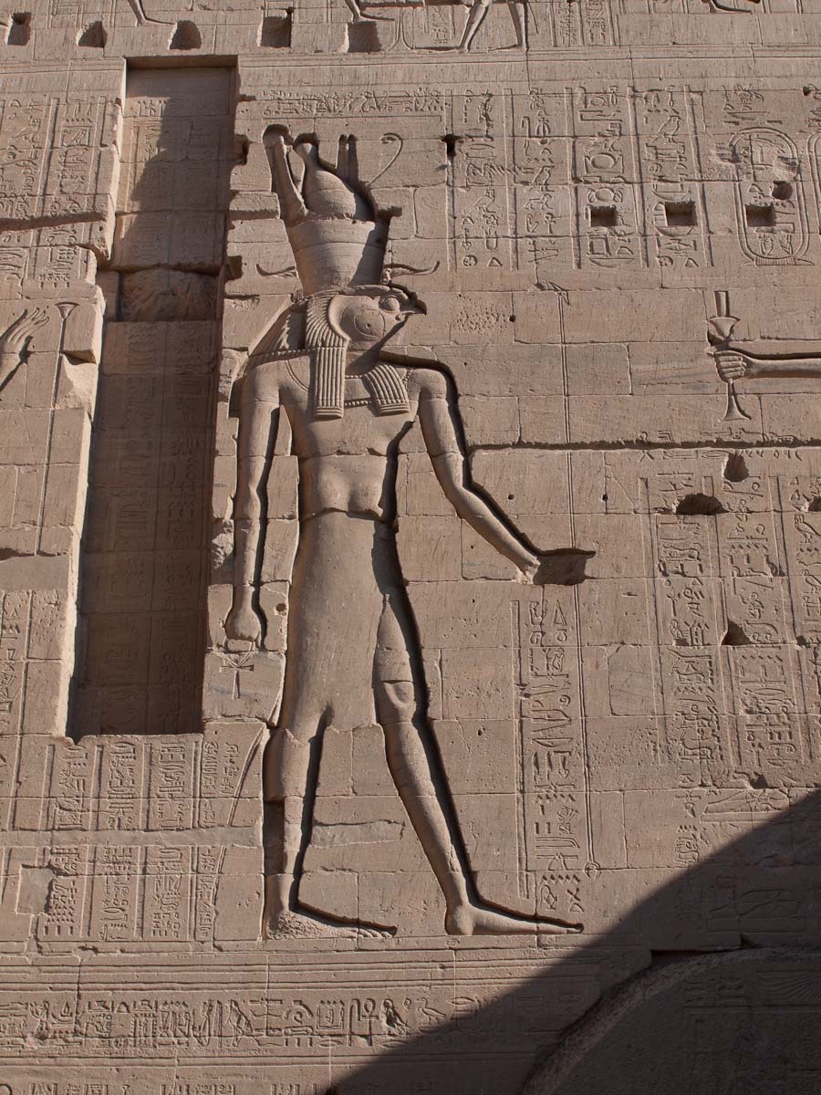 Decorating the façade are carvings of Horus and a man in a position that resembles a javelin thrower. Standing sentinel before the gate are two statues of Horus as a Falcon. In front of each falcon’s chest is a small man, believed to be one of Horus’ four sons.