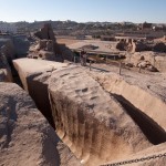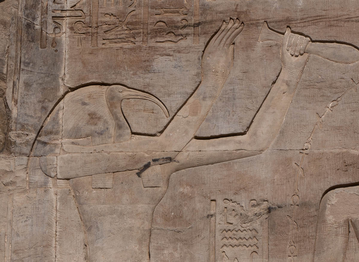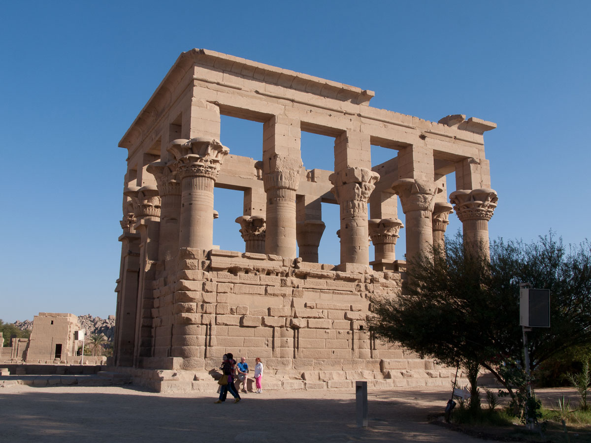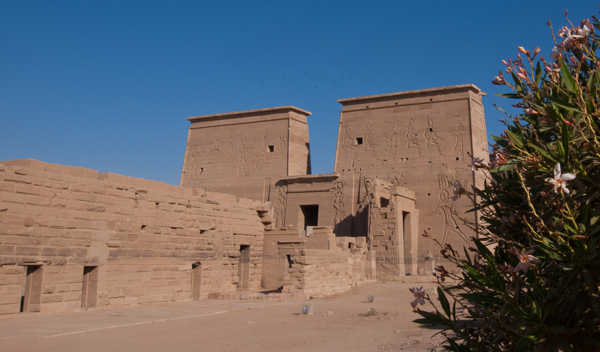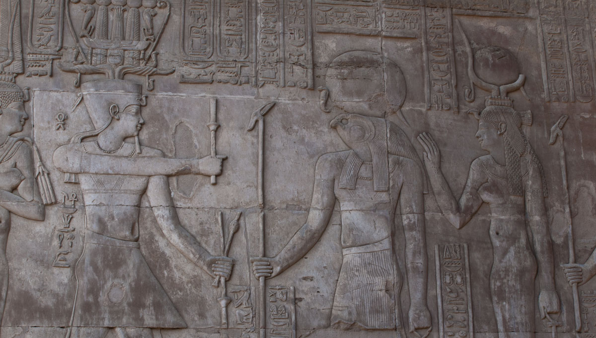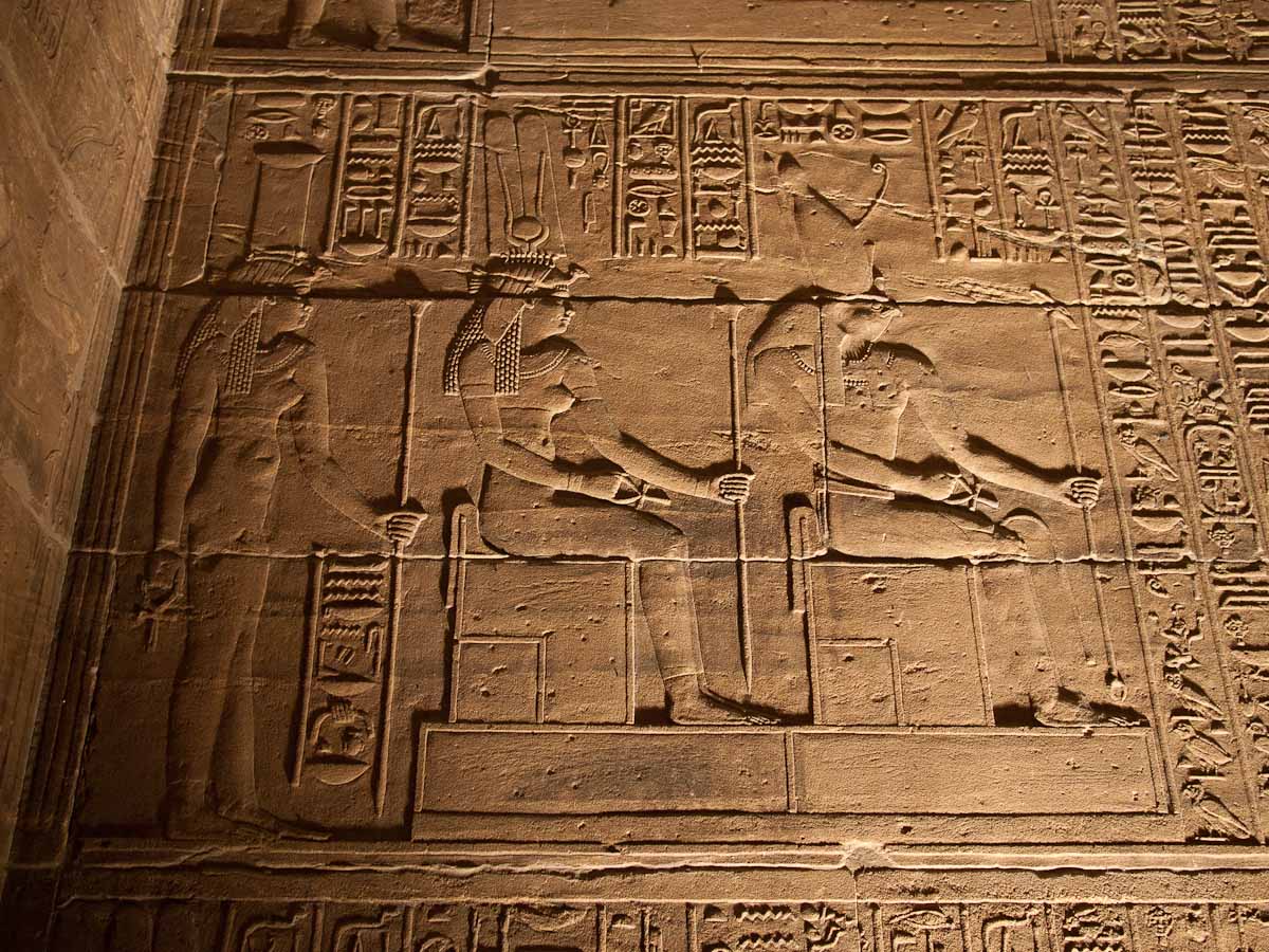 Decorating the façade are carvings of Horus and a man in a position that resembles a javelin thrower. Standing sentinel before the gate are two statues of Horus as a Falcon. In front of each falcon’s chest is a small man, believed to be one of Horus’ four sons.