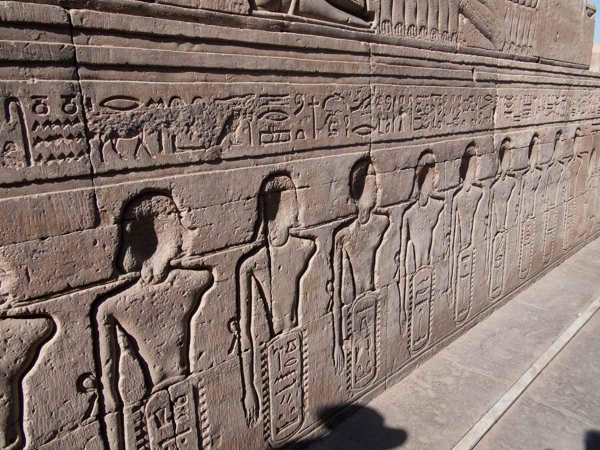 Before us towered Edfu temple, one of the best preserved temples in all of Egypt. Dedicated to the god Horus, Edfu temple is 118 feet high and a fantastic but small sized memory of the Egyptian builders and engineers. The temple’s gate is lower than the pylons to its left and right. Symbolizing the Nile and its east and west banks. The left pylon was the West, the right was the East, and the gate was the Nile.