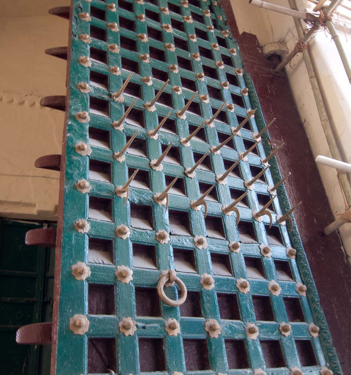 A fort’s gate is its weak link, the easiest place to smash in and take control. In India there are bristly, natural, and gray battering rams know as elephants. If three elephants charged at full speed in to your gate, you would be in big trouble. The Indians had to think of something to stop the elephants, and came up with an ingenious idea. They made scores of 1 ½-2 feet spikes all along the length of the gate. Knowing that men could tear them down, and elephants faces would be the most effective, they placed them around the height of an elephants face, stopping any elephant charges.