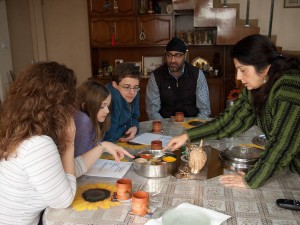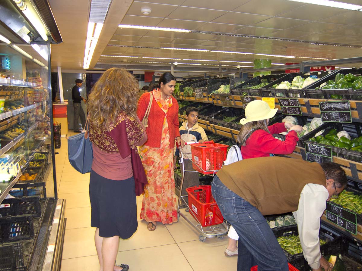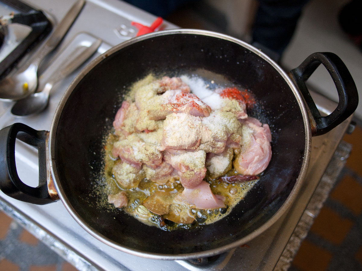 For our main meat course we learned how to prepare a fabulous mutton curry using a pressure cooker. The pressure cooker seems to be a very common tool here and I have resolved to buy one when we get home. It works by containing the steam which becomes pressurized and passes through the contents of the pot, thereby heating from the inside as well as the outer surface. The flavors are infused and sealed within and the total cooking time is dramatically reduced: the mutton curry in the cooker requires only 15 minutes or 5 “whistles,” without it the dish takes 60-90 minutes to cook.