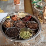 We started with the spices. Jyoti produced two round silver tins each the size of a dinner plate. Inside each were a collection of smaller silver tins each filled with a different spice; ground spices collected in one and whole spices in the other. A good cook grinds her spices regularly. Jyoti’s spice vendor prepares miniature cellophane bags of her favorite custom blends, which she then grinds fresh as needed; women who live outside the big cities grow and dry their own from seed. To me, the tins resembled a painter’s palette literally and figuratively. I imagined one in my own kitchen: bright yellow turmeric, deep red chili, pale green ground mango. You could see and smell the promise of something beautiful. The whole spices captivated my interest for their very different shapes: the dried mace blossoms were indeed flower petals, cinnamon bark came as chips not the rolled sticks we get at home, and the cardamom pods came in a small fresh green and large dried brown version I had never seen before.