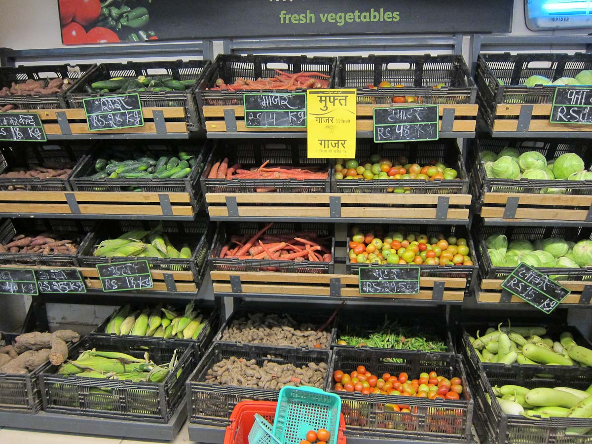 Our first stop was the vegetable market, which turned out to be closed because it was a full moon day: the markets here are open every day save two—the day of the new moon and the day of the full. It was a neat reminder of the prominent role the stars play in India. With the market closed, we headed to the nearest traditional supermarket which had a staggering array of fresh vegetables and more varieties of grains and legumes than I had ever seen (interestingly, I didn’t see a meat counter or butcher section anywhere). Rakshita worked her way through easily and laughed when I asked her if she knew how to cook with these myriad ingredients. She told me that her family has a farm on which they grow almost all of their own grains, legumes, and spices—including the wheat which they grind for bread and the mustard they press for oil. I was awed.