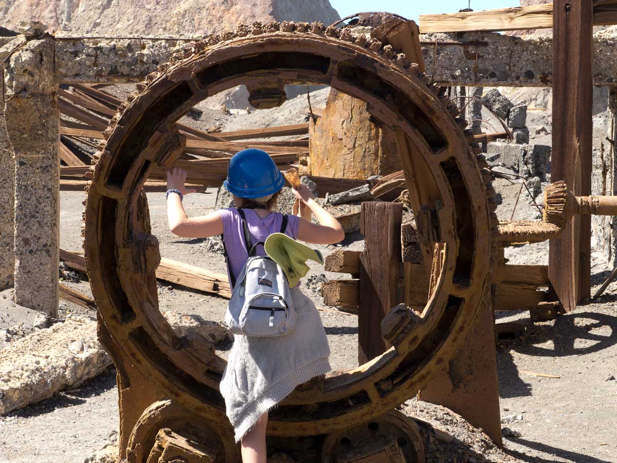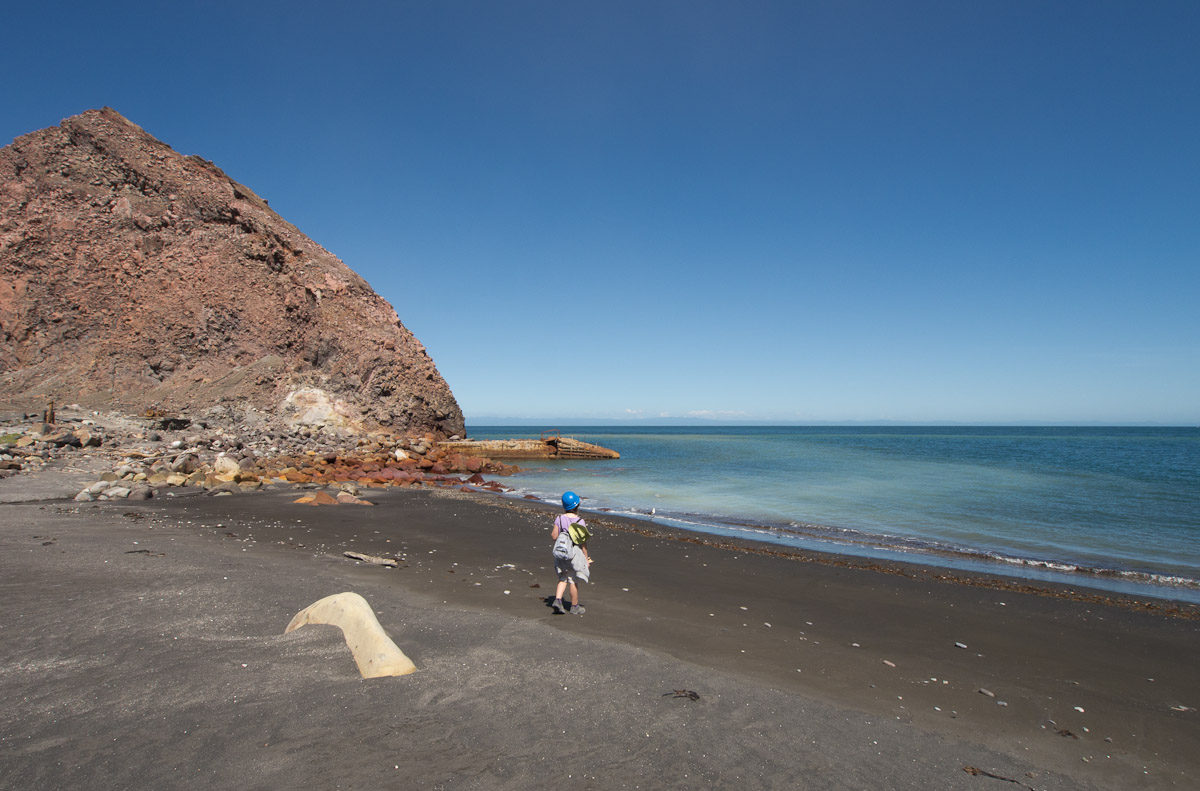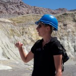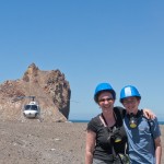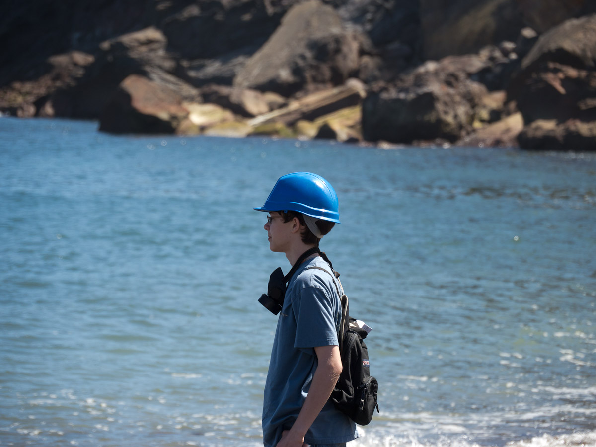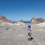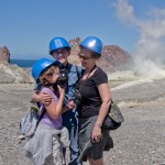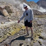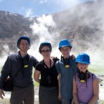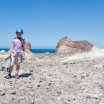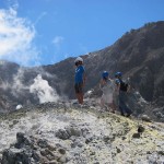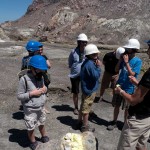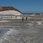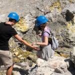 We stopped for a bit at the Island’s beach. The deep, rich blue of the water was shocking after spending three hours looking at green, yellow, and rusty red rock. As we explored the beach, Giles noticed that the deeper you put your fingers in the sand the hotter it became. In fact, earlier on our trip, Colin had unearthed a stone and the underside had burned his fingers! A difference of a few centimeters was all it took to go from warm to burning. That is how close the magma and super-heated gas was to the surface.