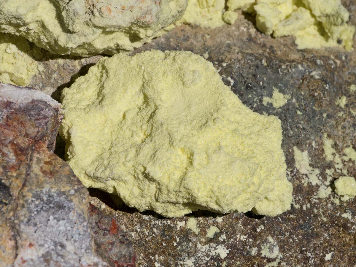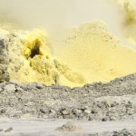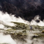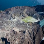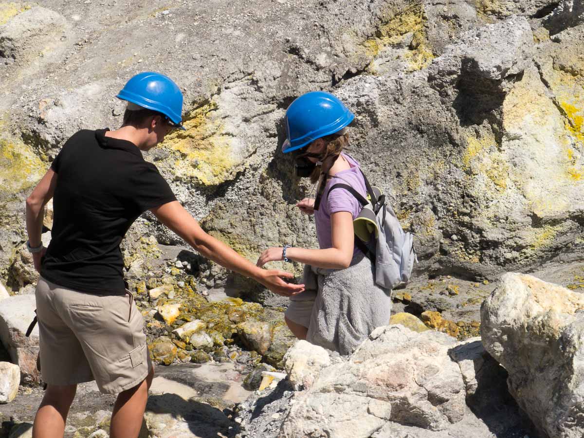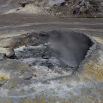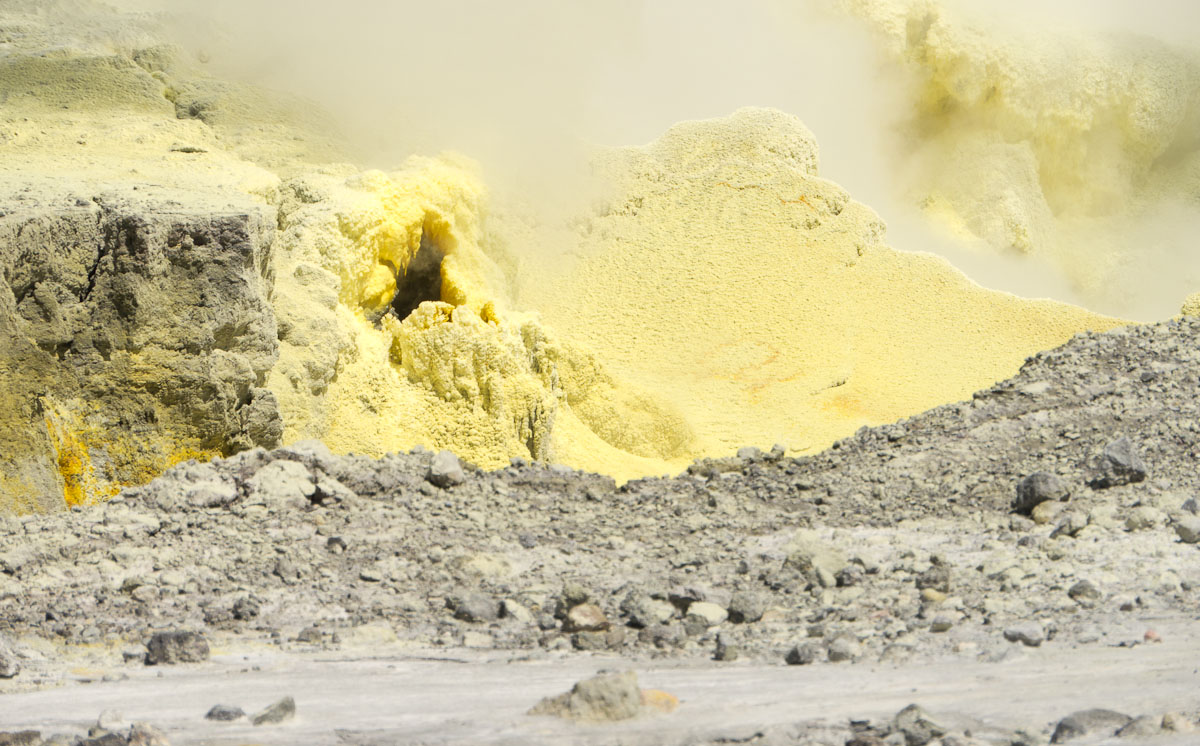 When we landed our pilot gave us each helmets and gas masks! Then we headed out to the pool of arsenic, acid and sulfur, which was as hot as the hottest temperature you can get out of your kitchen faucet. Our pilot told us all about the island and volcanic activity. Gas vents exerted noxious, sulfur scented gas in to the air, and scattered about were a few sulfur crystals. Then we turned a corner and saw a massive chunk of yellow land. More sulfur. All of these factors bequeathed a horrible odor on the Island.