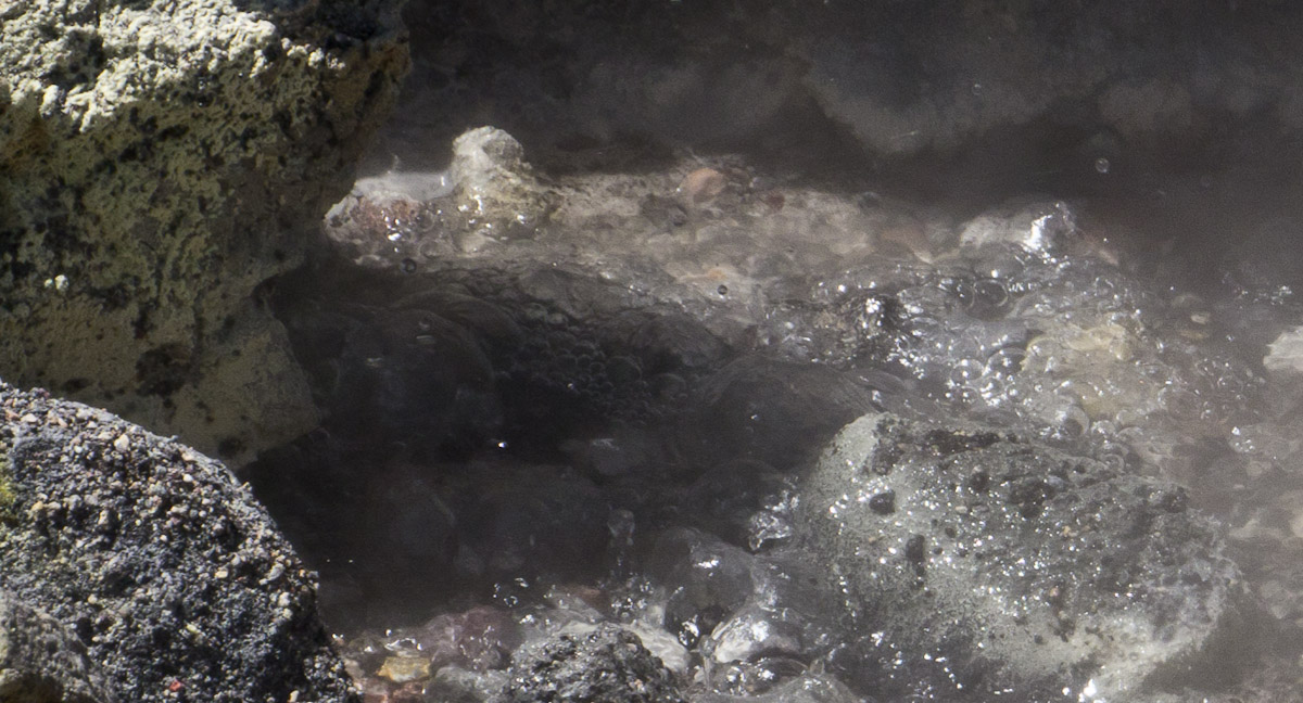We walked along jumping over streams of hot-tub temperature water, and made our way to the pool of nastiness. The water was greenish yellow, and to prove that that was not a reflection, but the actual color of the water, our pilot threw a stone in to the pool. The water which splashed up was green.