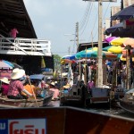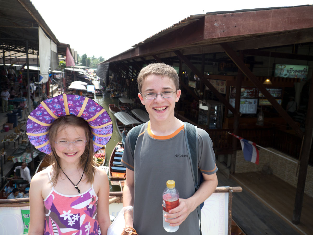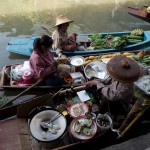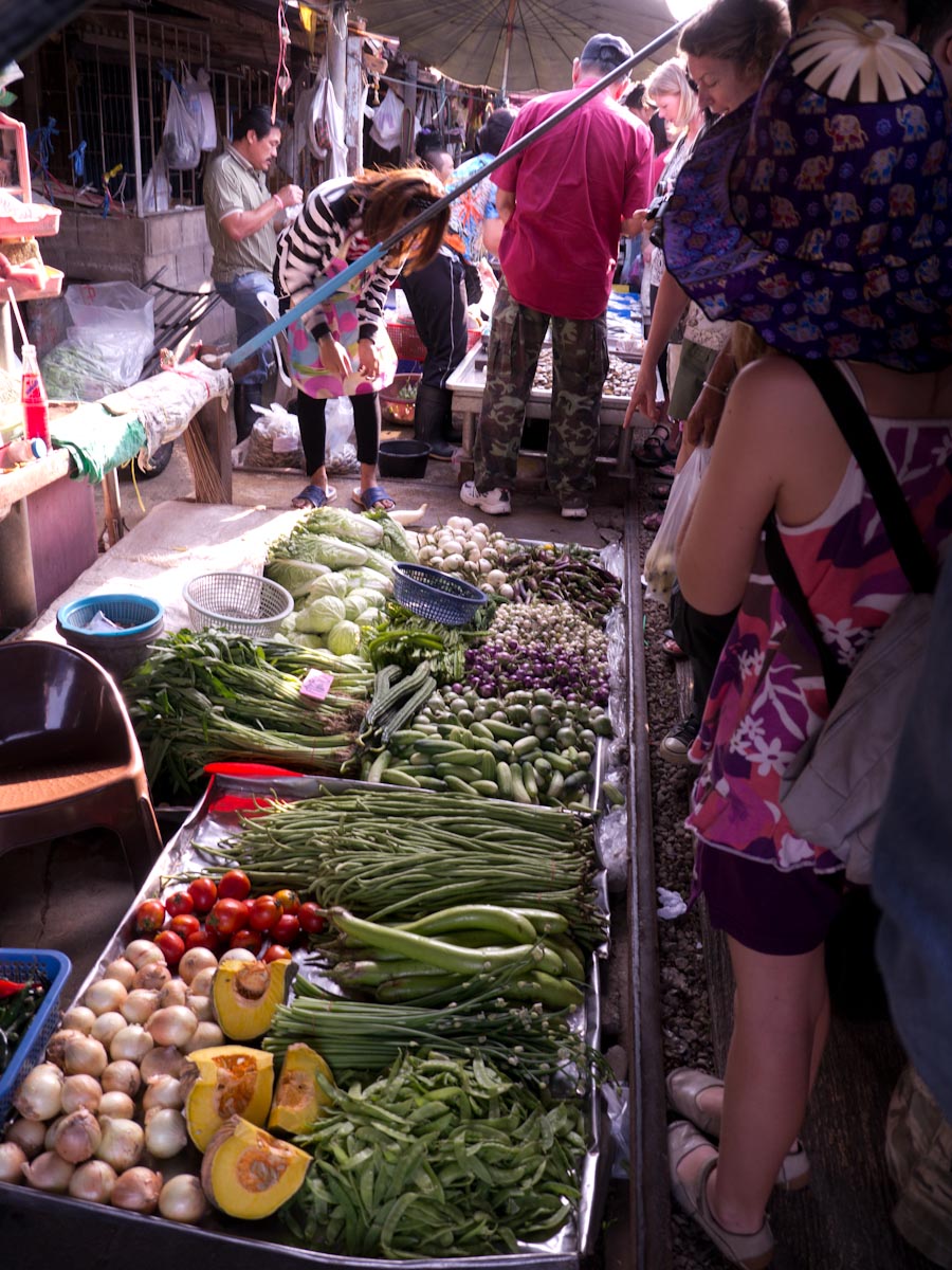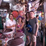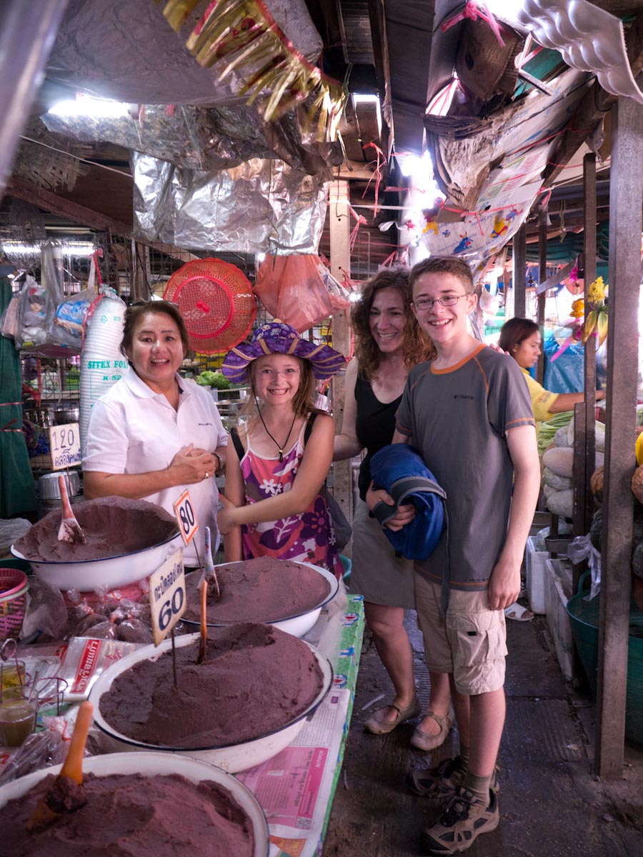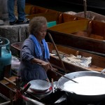 As we entered the heart of the market, the stores were all on concrete and situated at about our head level; the trinket boats were replaced by anchored food vendors. We disembarked and shopped around the market. Here, I had my first real haggling experience ……I loved every bit of it, but the shopkeepers definitely did not. I was consistently bringing the prices down to one fourth or LESS of the original price. Suzy said I was better than her, but I don’t believe it.