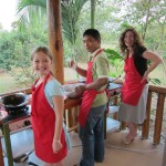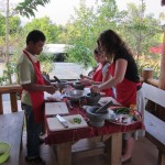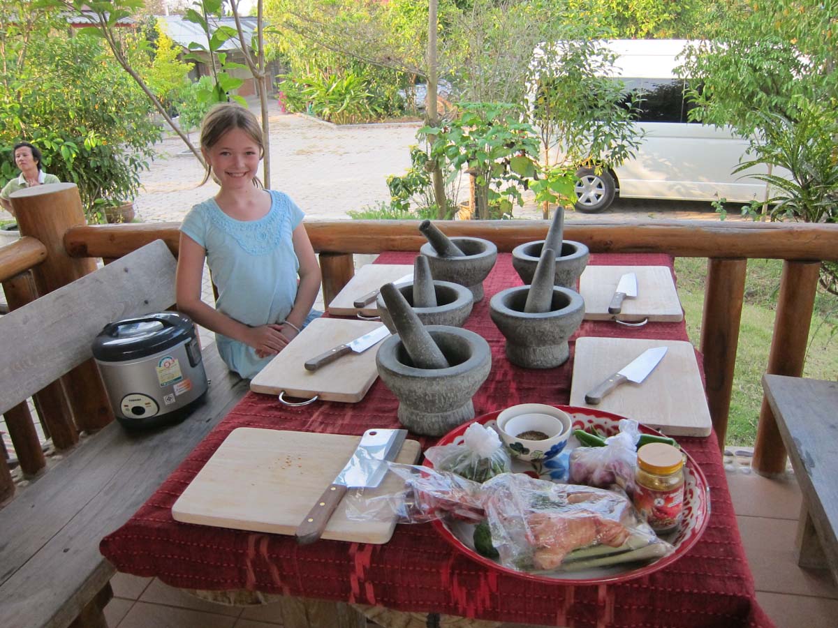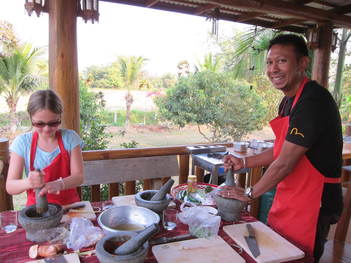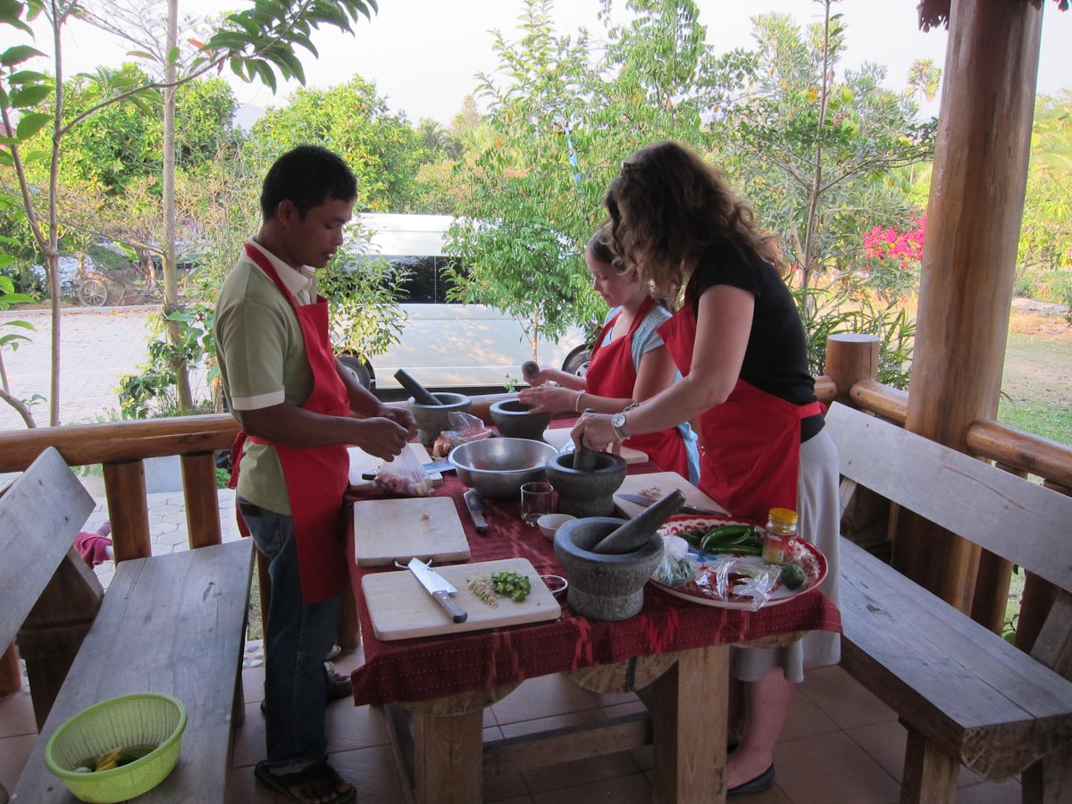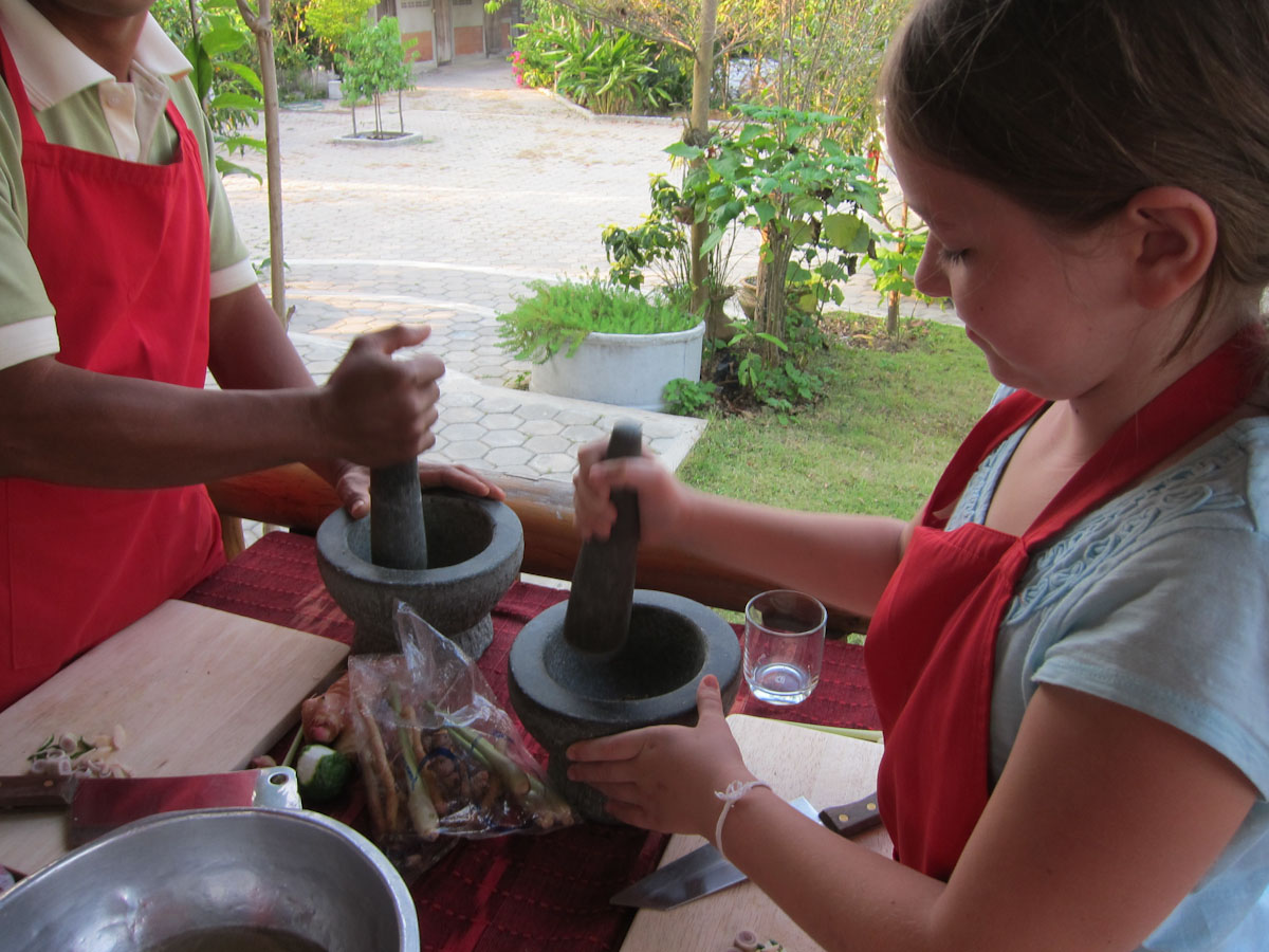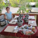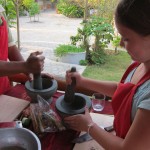For the more cultural foods, I got permission to watch a family cooking lesson. The father and son stayed home because the son was ill, but the two girls came. A table was set up with five mortar and pestles but because of the missing boys, that was too many. The tour guide and chef-teacher joined though, so they were only one person short.