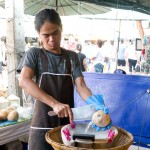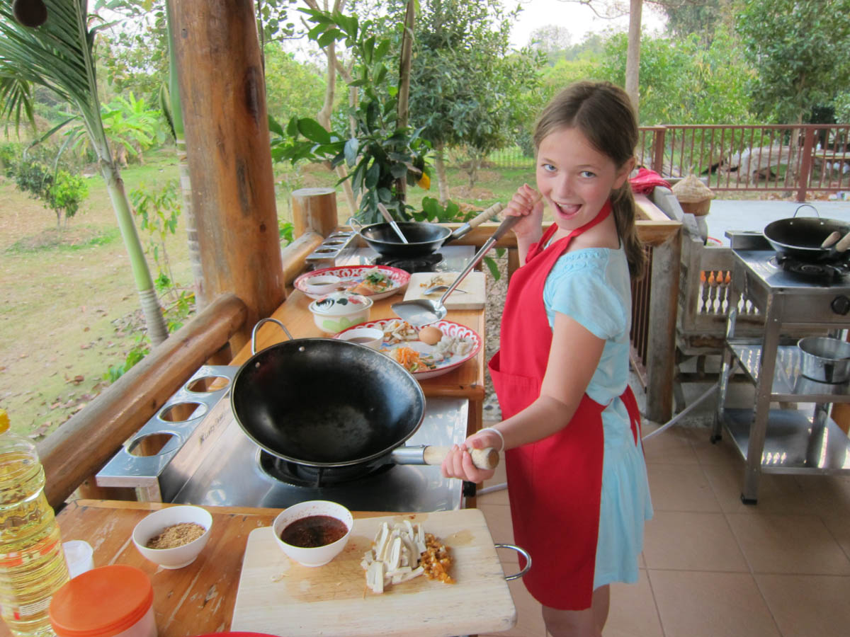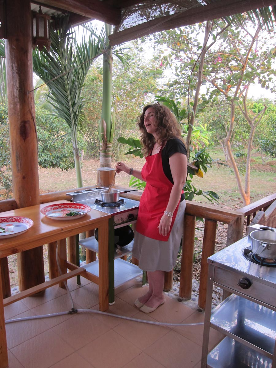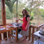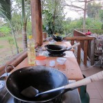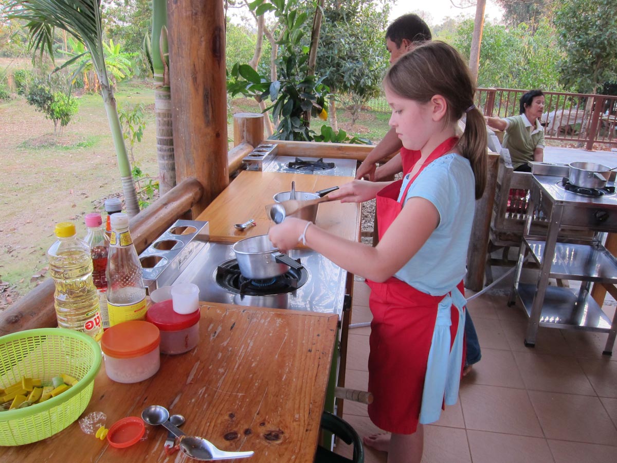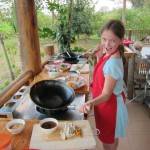 While the rice, sticky and plain, started steaming, they started cutting up various vegetables and roots for their curries. The mother and tour guide used green chilies, thus making green curry, while the chef made red. The daughter did not seem to like spicy though, and put in a very small red chili, which ended up making white curry. When all the things were chopped they smashed them in the mortar and pestle to make curry paste. But not before I noticed the tour guide put lots of extra hot chilies in the curry for their driver.