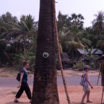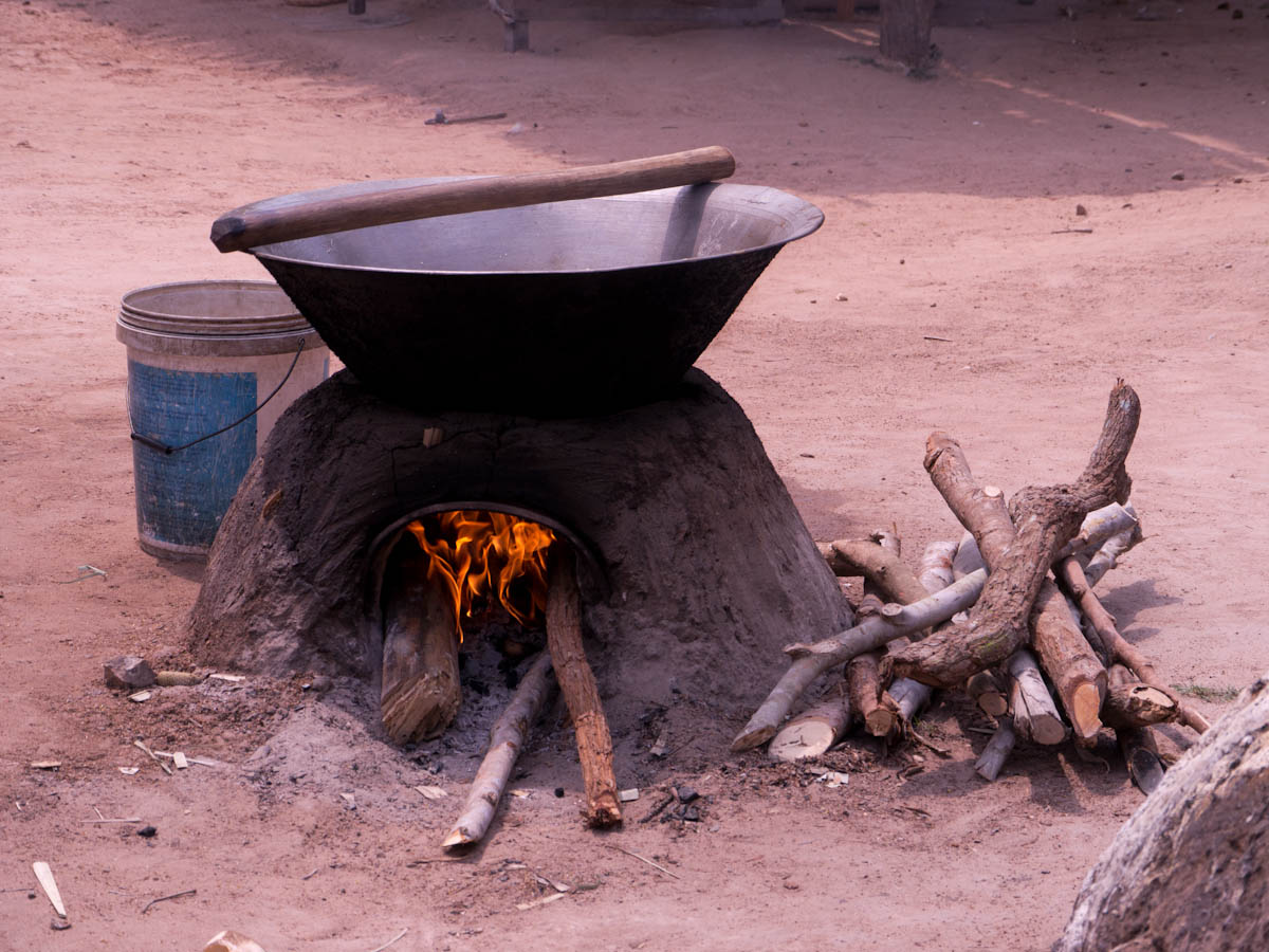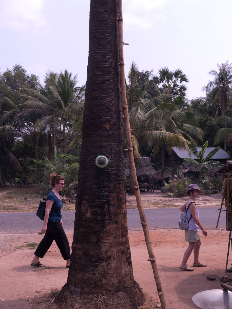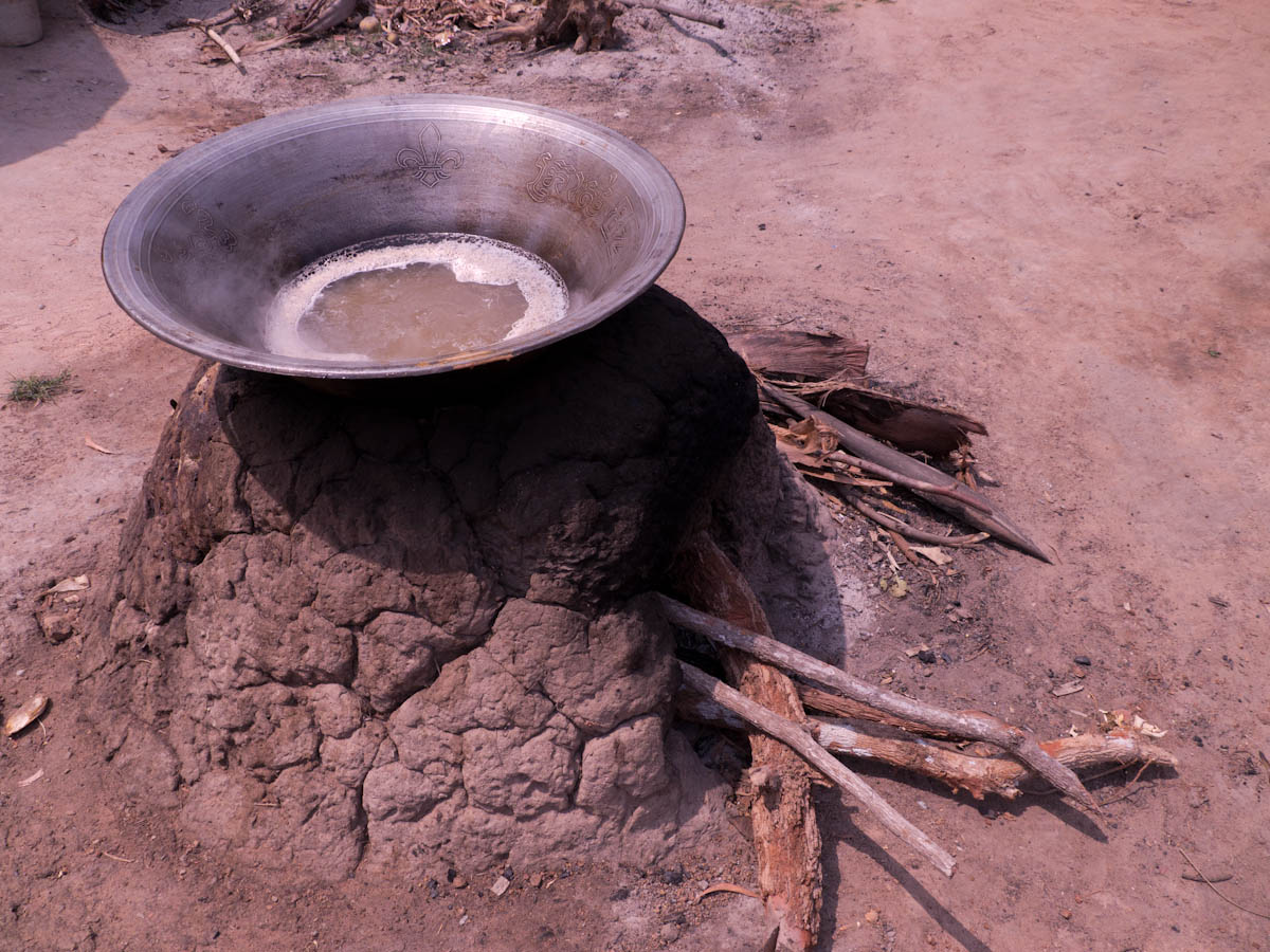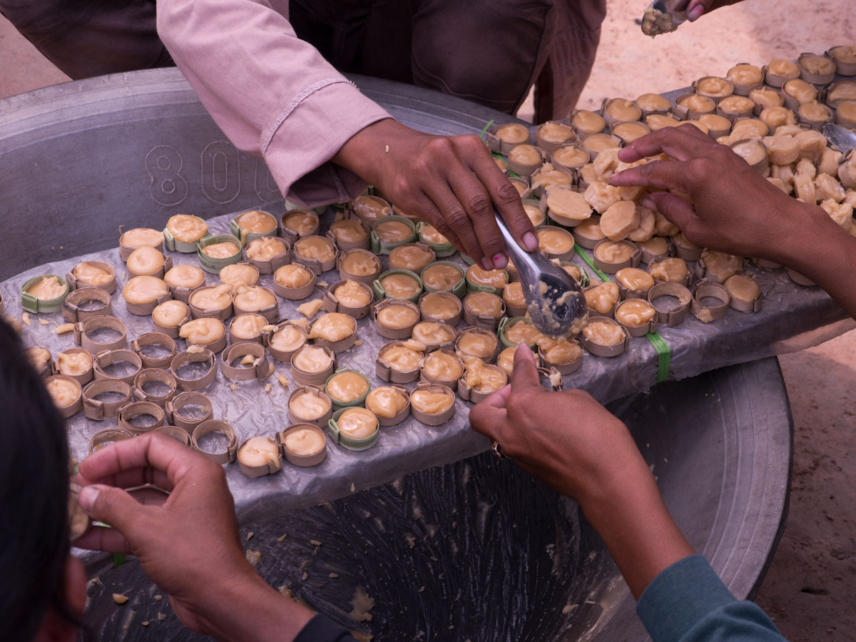 In another village, we saw women making palm sugar candies. They have hollow bamboo cylinders, and they use bamboo ladders to climb up palm trees. Then they drill holes and hang the cylinders below. They leave them overnight. The next morning, the cylinders are filled with sap, and they take them down and pour them all in a big, wide, metal pot. Already they had prepared a small clay mound. The mound was hollow and had almost no top. In the kiln (mound) they place firewood and light a fire. Then they place the pot on top of the kiln and the sap begins to cook.