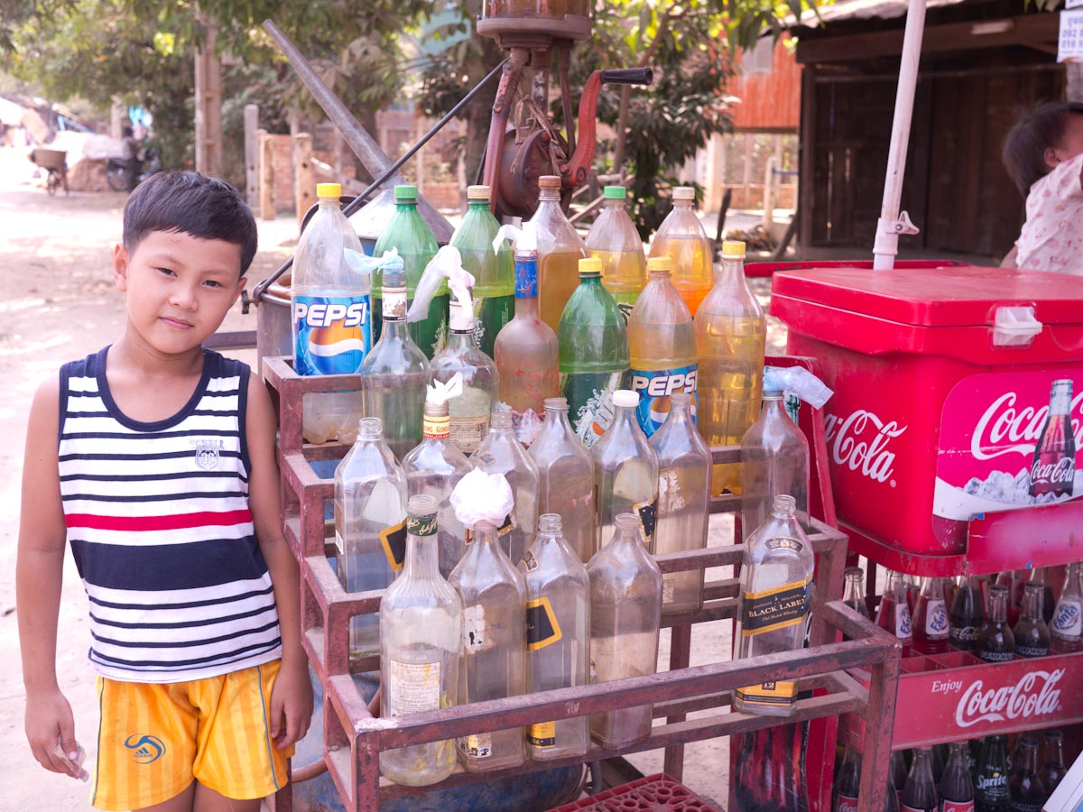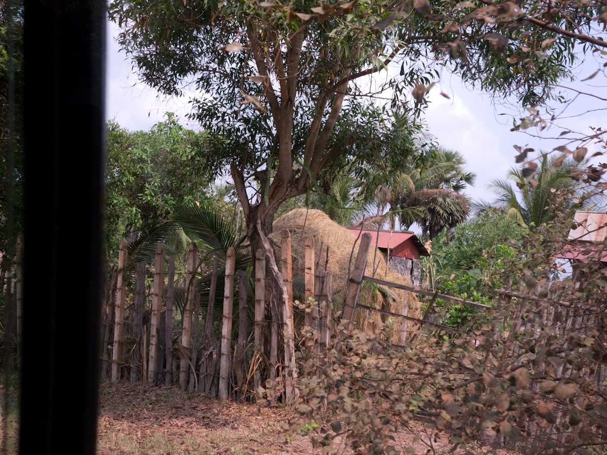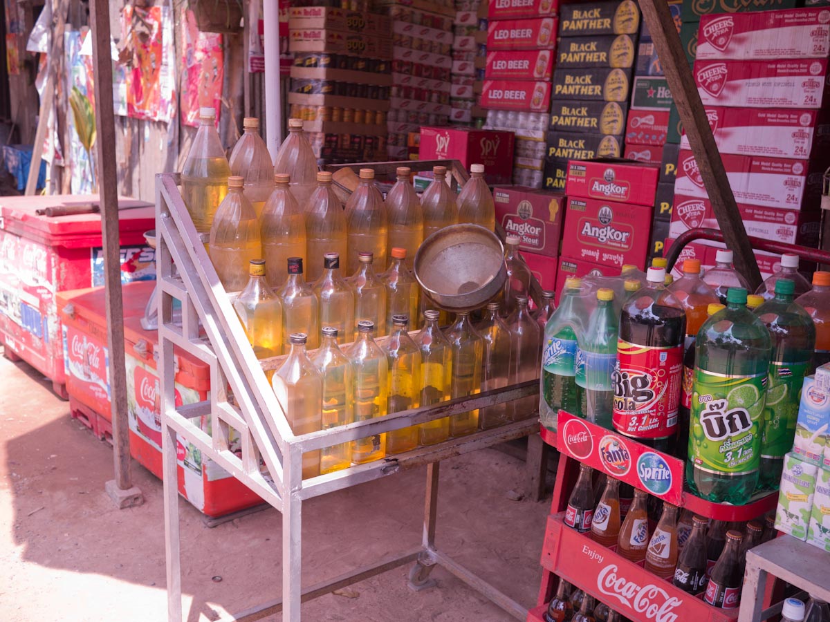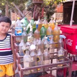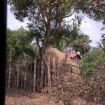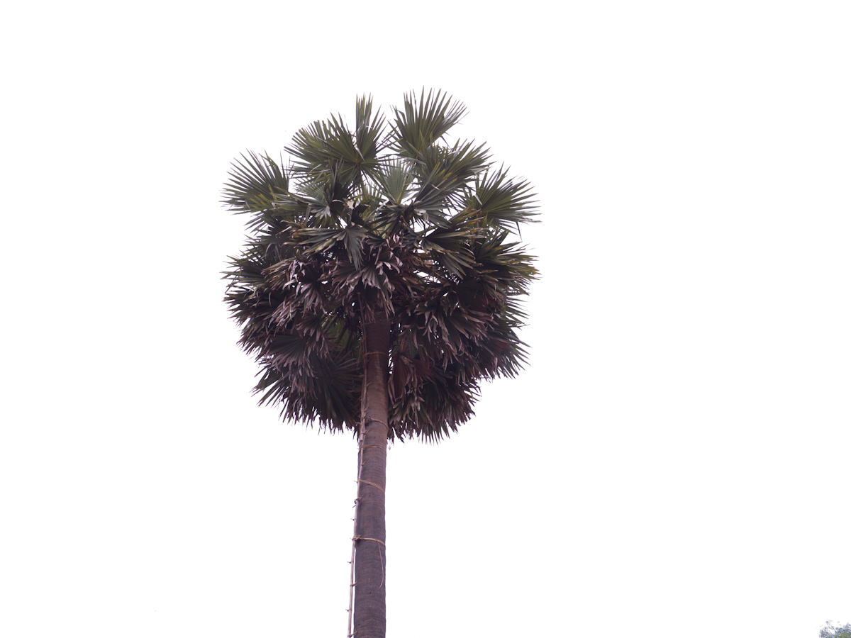 In another village, we saw women making palm sugar candies. They have hollow bamboo cylinders, and they use bamboo ladders to climb up palm trees. Then they drill holes and hang the cylinders below. They leave them overnight. The next morning, the cylinders are filled with sap, and they take them down and pour them all in a big, wide, metal pot. Already they had prepared a small clay mound. The mound was hollow and had almost no top. In the kiln (mound) they place firewood and light a fire. Then they place the pot on top of the kiln and the sap begins to cook.