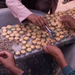 The candy is made by taking dollops of the batter-like sugar and ladling it into hard, leaf rings. The sugar quickly cools and hardens, when this happens it it pooped out put on a tray and the ring is refilled. When they are finished and have used up all the sugar in the bowl, they package them in groups of about a dozen. The package is made of what looks like bamboo leaves, and the candies are stacked like a stack of coins, only the candies are considerably thicker. You can get 3 packages for one US dollar.