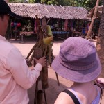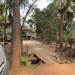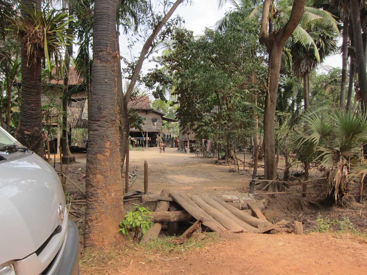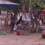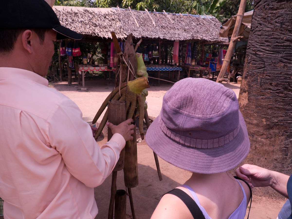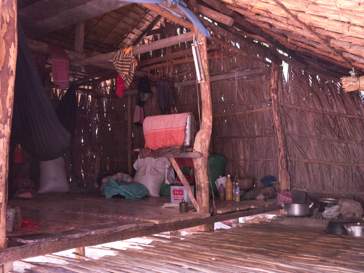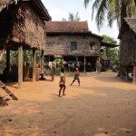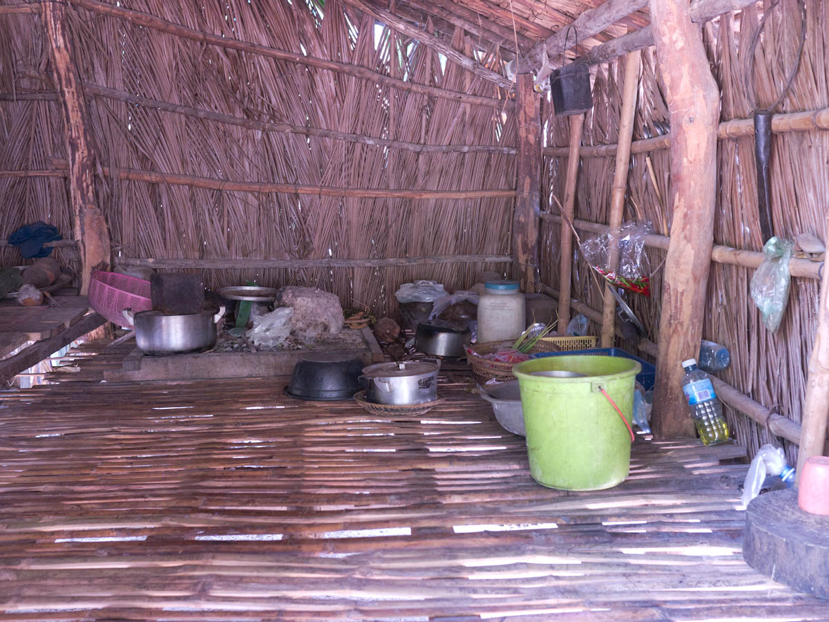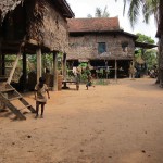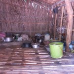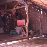 We look around at the homes of the villagers. Wooden and bamboo huts with thatched roofs make up a good portion of the home styles. We take a peek inside, as our guide explains. The huts have only one room, so how do they organize everything? On one side there are tools,toys and shoes. The other side has clothing and the kitchen. Other miscellaneous items are scattered in different corners, but in the far corner, the kitchen quadrent, lies a boxy, black-and-white T.V. Since there is no electricity, people and little businesses use car batteries and motors as their source of power.