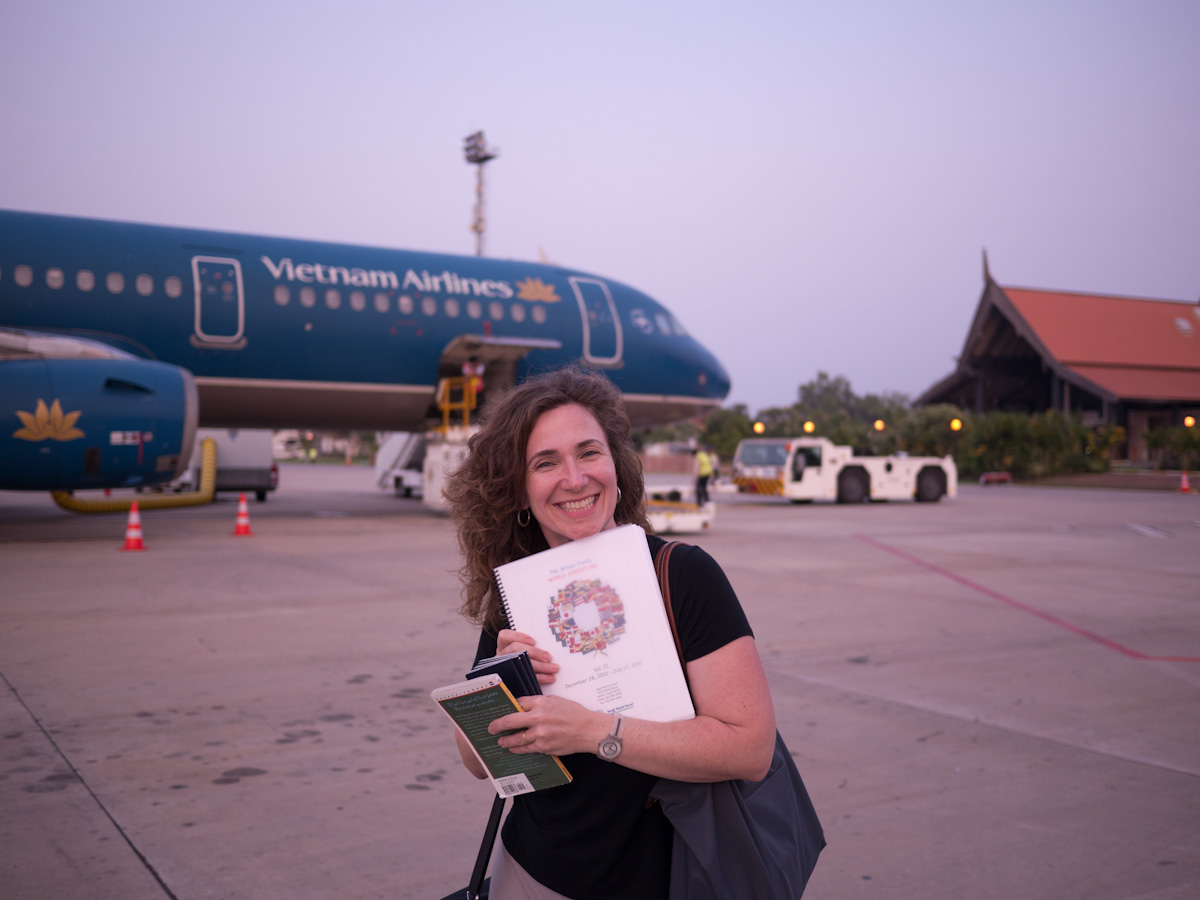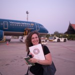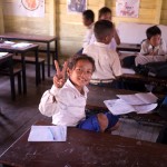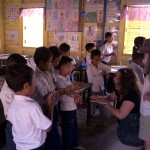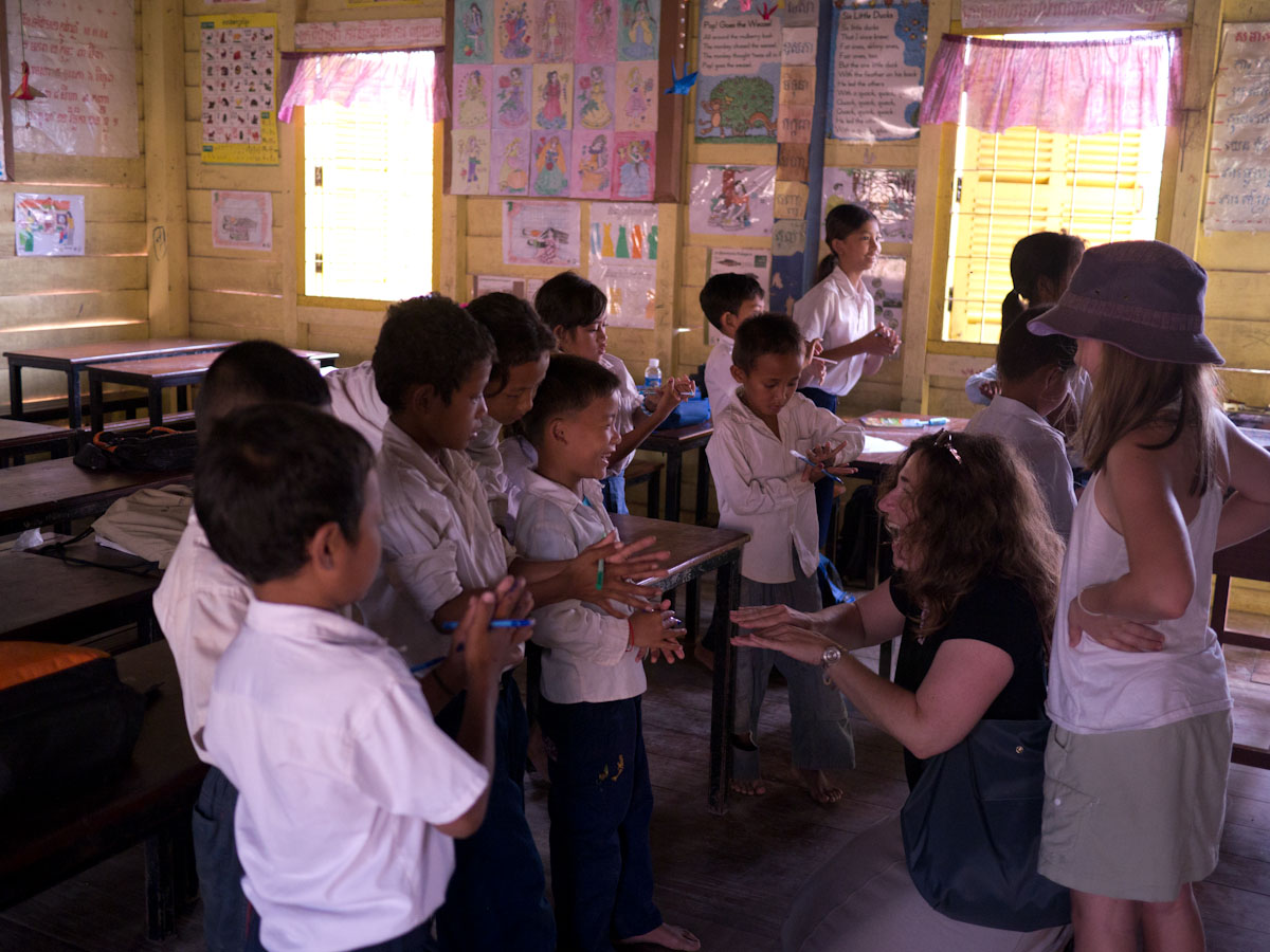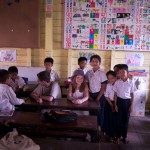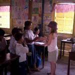 We went into a large room in the building everyone else was in. On one side there was a big black board and on the other there were many benches (which the kids were sitting on) with tables across from them. It was hot and sweaty. There were four big windows but there was no glass, or any material, in them. We gave the supplies to the teacher and said hello to the kids. They all stood by their table/desks and, as one, greeted us in Vietnamese. There were 42 kids between the ages of 6 and 13. They were all in white shirts and navy blue bottoms. All their eyes were fixed on us. I felt shy, out of place, and self-conscious.
