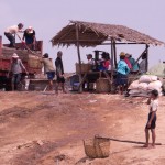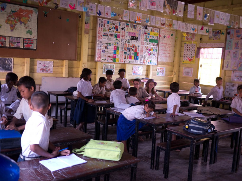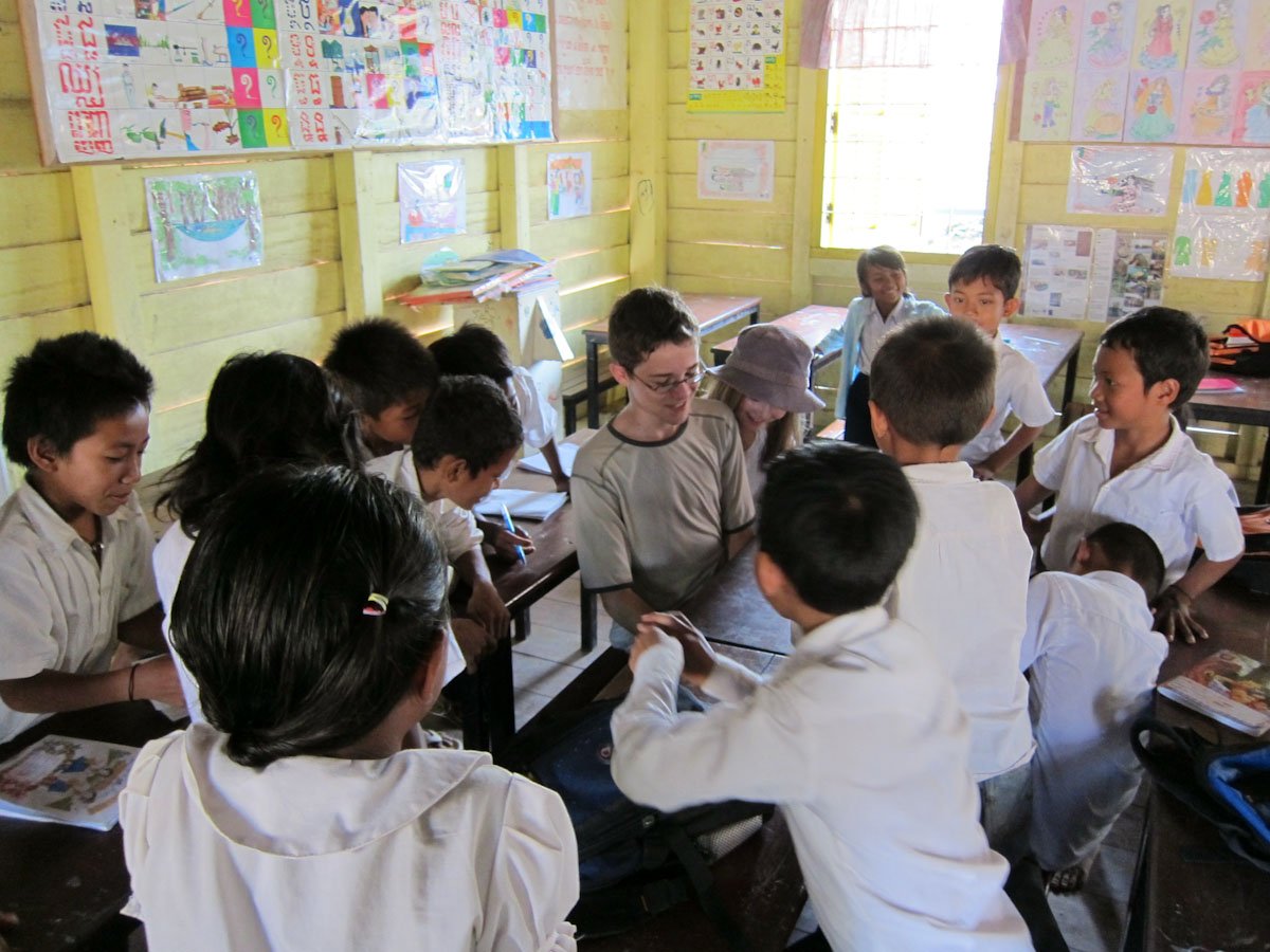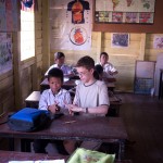 On the way to the river we had stopped to pick up supplies like pencils, chalk, and paper. These were for the school we were visiting. At last we got to our destination. We walked across a stick bridge to two big buildings. Kids were coming out of one which turned out to be the cafeteria (they had just finished lunch). They were very loud, even louder than the kids at Lilja. They were happy and smiling.