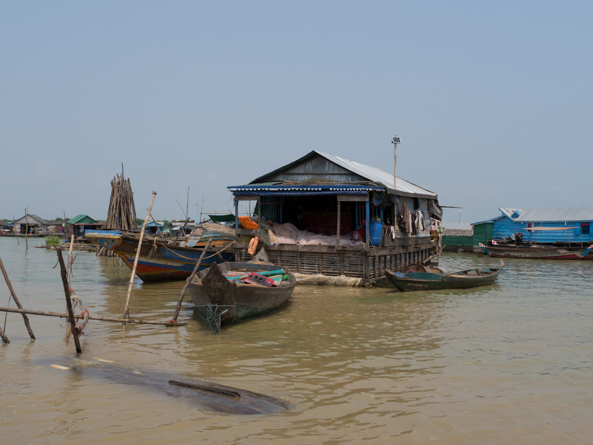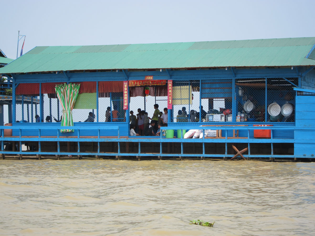 When we reached the lake and the floating village first came into sight all you could see was little blotches, but as you got closer you could start to make out individual huts. Most huts were on boats, but as we got further in some were on little floating docks. The houses on the docks were much bigger than the rest. They had satellite dishes which were powered, like all electric things in their homes, by car batteries. Many houses were painted turquoise.