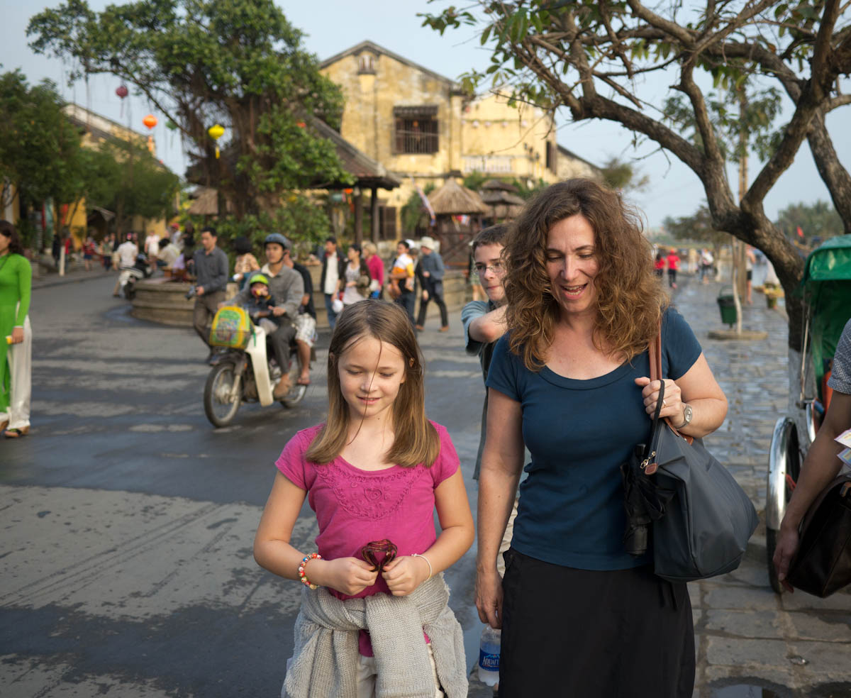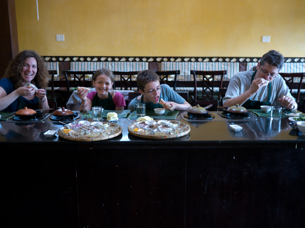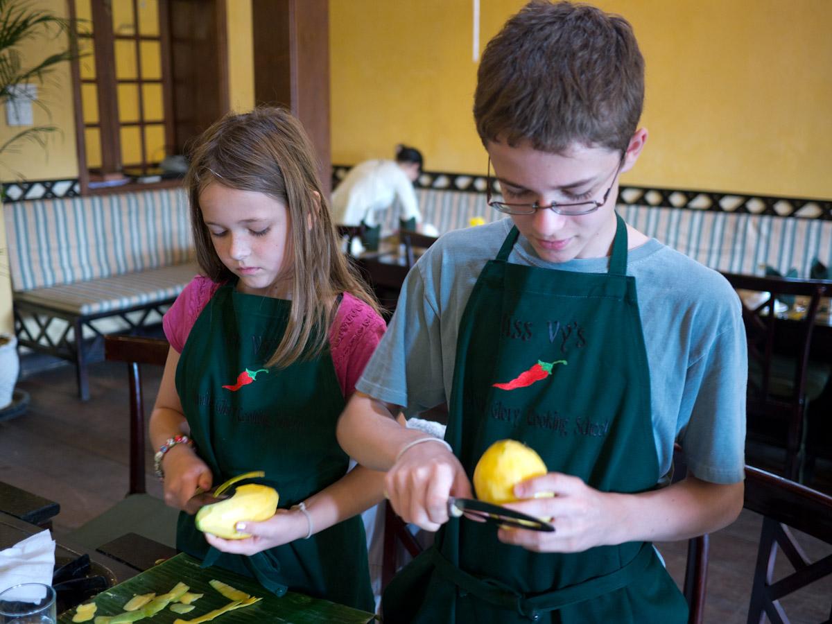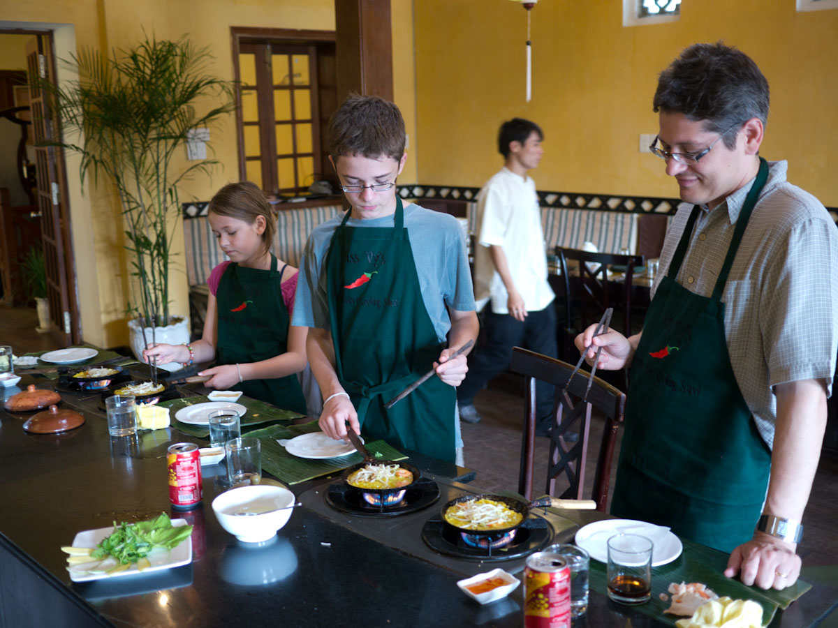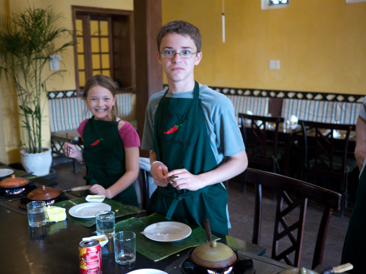 After settling in, we headed to Hoi-An for a hands-on market tour and cooking class at the Morning Glory restaurant. Although cooking is usually Gina's favorite, the whole family enjoyed discovering new fruits and vegetables and then making our own spring rolls, marinated chicken, pancakes, and green mango salad. Afterward, Katherine and Gina discovered the tailoring shops of Hoi-An which are especially good for casual ladies wear.