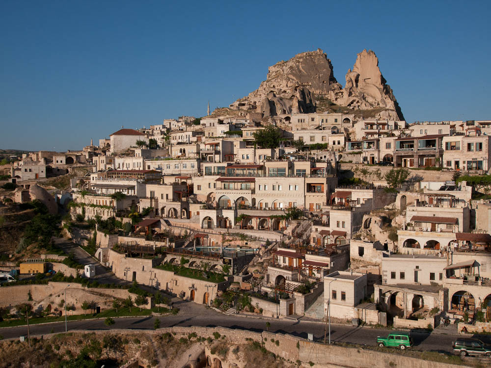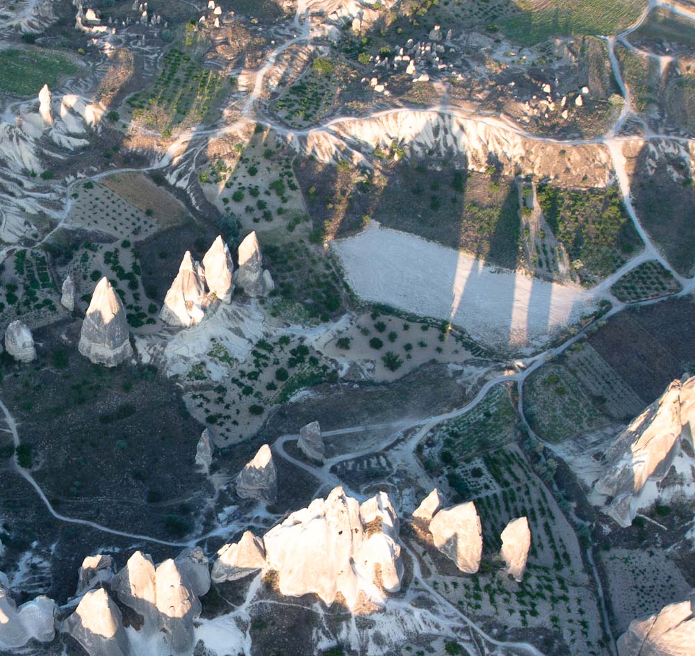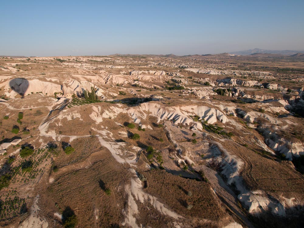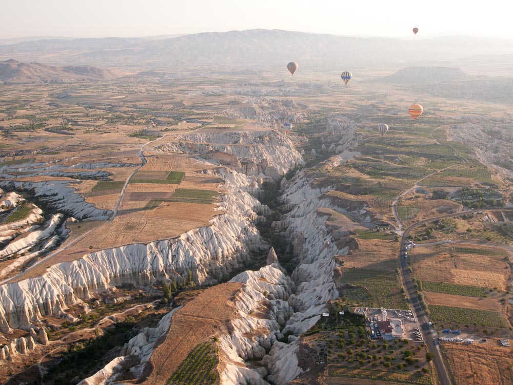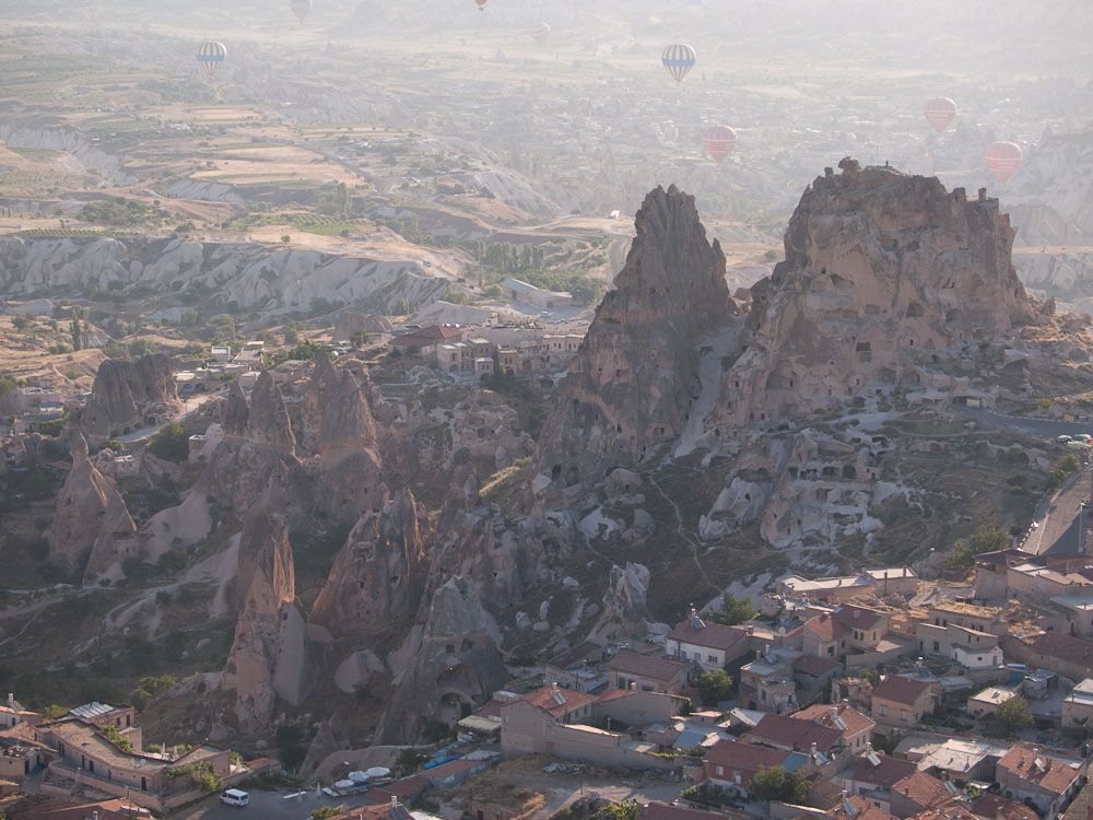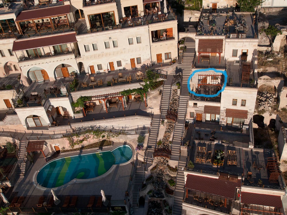 The flight was smooth and so silent we could hear birds chirping below. Our pilot took us up to 600 meters (yes, that is almost 2,000 feet) before bringing us back down to 200 meters where we could wave at the early morning breakfasters on the terraces below. Amazingly the wind took us right over our cave hotel and we could even see our own door.