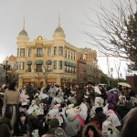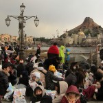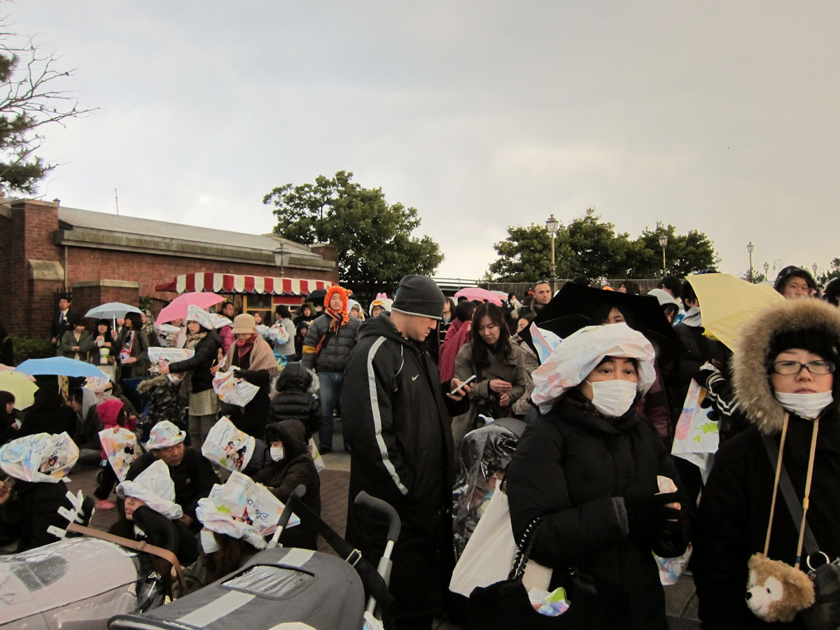 Some of them were being rescued though. Ahead of us, in front of the “old Italian” arch, stood a human funnel. Disney employees shivered and directed. Waving glowing, yellow, airplane-directing-like things, and small, green glow-sticks. We headed through the funnel, thanking the employees as we went. They were still smiling, even now.