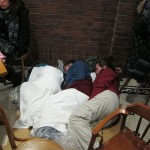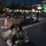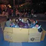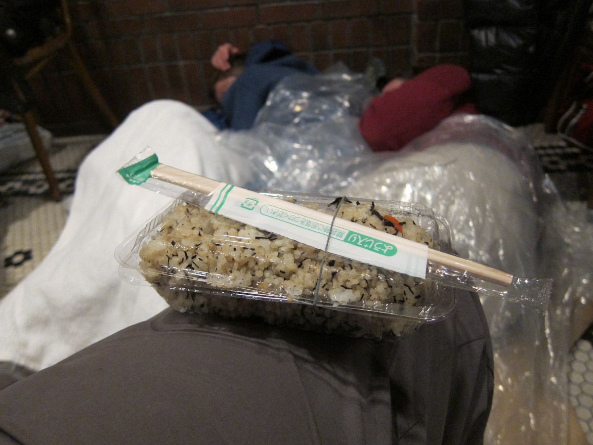 Dad and Katherine made the cardboard in to a “tatami” mat for us all to sleep on. We wanted to be like a real Japanese family and so took off our shoes. That’s when we realized that we had to keep our shoes on. We might have to leave at any moment, and any delay could prove to be fatal.