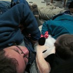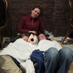 At first Mom and I sat with our backs against the wall, but then I realized that Dad’s back would hurt him if he didn’t have support, and so I switched with him. Katherine then helped him by giving him stuff to support his lower back.