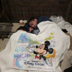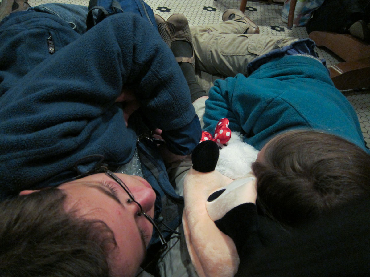 Katherine used her newest hat, a massive Mickey Mouse hat with a tiny body hanging off the back, as a pillow. Mom used her purse. I used the blue backpack. Yeah, the blue backpack is great, until you use the side that has hard plastic cases and bottles instead of the bubble wrap side. It turns out it didn’t matter. When I woke up in the middle of the night I would usually reposition myself, and sometimes the blue backpack (I woke up a lot). Sadly the bubble wrap had been squashed and was useless until it was un-crumpled. But you know me. I’m a master of falling asleep. So sleeping on a floor with an uncomfortable pillow was NOT that much of a challenge. J